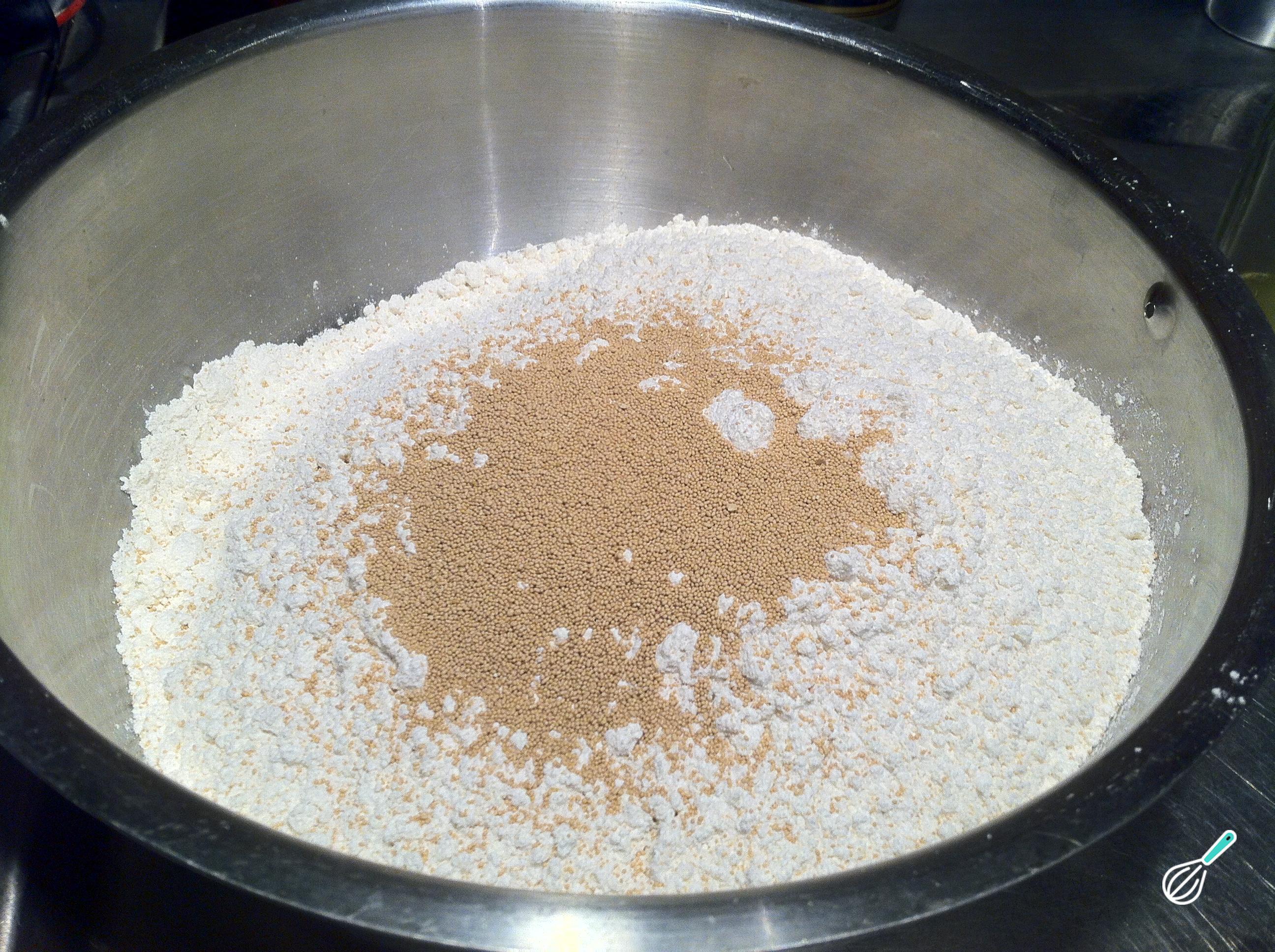 Para iniciar a preparação da massa, coloque em uma tigela, a farinha peneirada, o fermento e o açúcar. Em seguida, usando um garfo, misture os ingredientes secos.