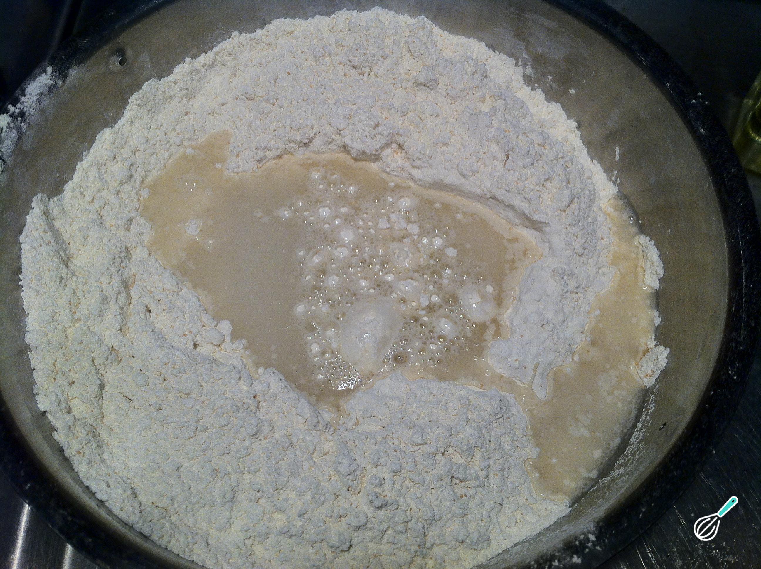 Nós fazemos uma coroa com a farinha e, no centro, despeje a água com sal e óleo para começar a misturar e amassar.
