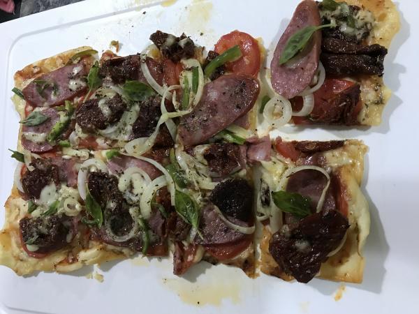 Gostei da massa, ficou bem leve e crocante, com certeza farei mais vezes, dessa vez fiz de calabreza e portuguesa. Não sobrou pra foto kkk. da proxima vez vou tirar a foto antes. Abraço