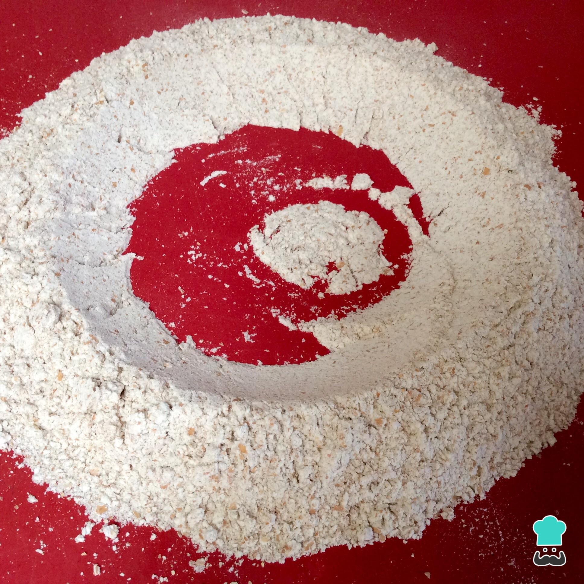Coloque a farinha em uma superfície plana e faça um buraco no meio formando uma espécie de vulcão. Recomendo que utilize farinha integral sem glúten, no entanto pode usar qualquer farinha sem glúten.