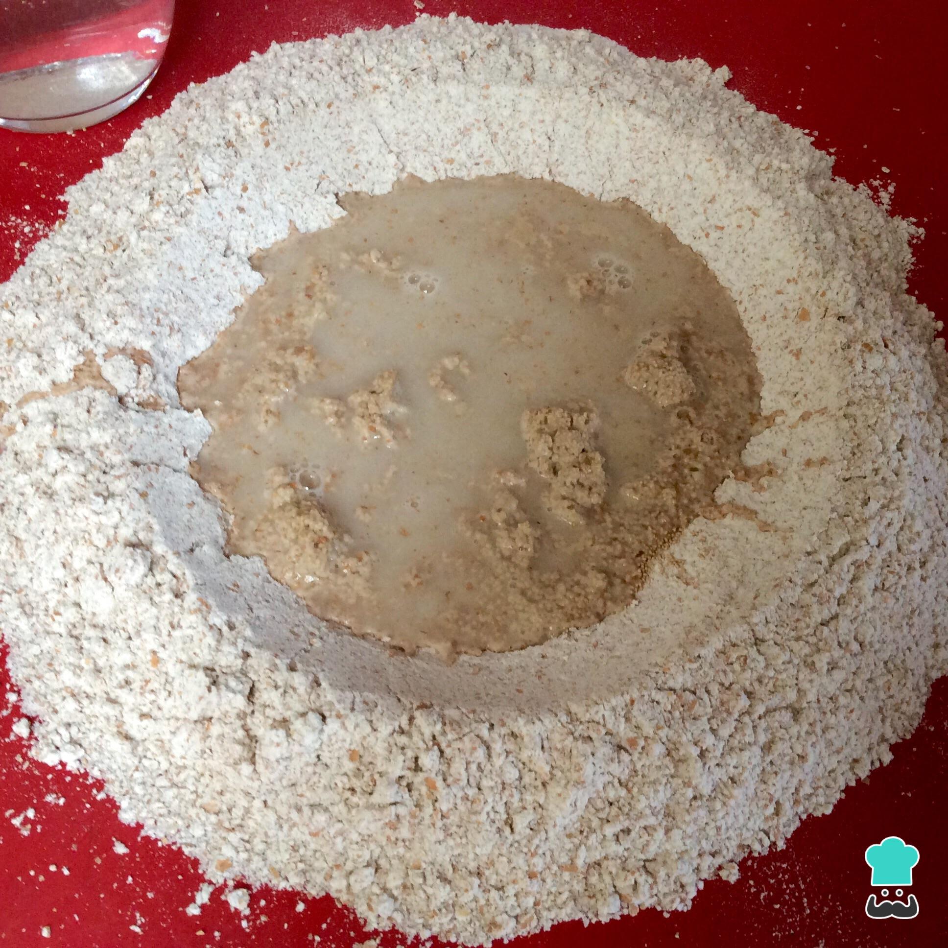 Em seguida, adicione o fermento seco e a água morna em volta do vulcão. Acrescente também uma pitada de sal e em seguida misture muito bem o fermento com a água até que se forme uma espécie de creme.