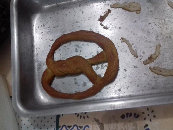 Depois disso sove a massa do pretzel em uma superfície enfarinhada, durante 1 minuto ou até ficar bem suave. Divida a massa em 8 partes e enrole em rolinhos com 40-50cm de comprimento. Depois entrelace as pontas dos rolinhos e junte à massa. Cubra os pretzels com um pano e deixe crescer por mais 20 minutos.
