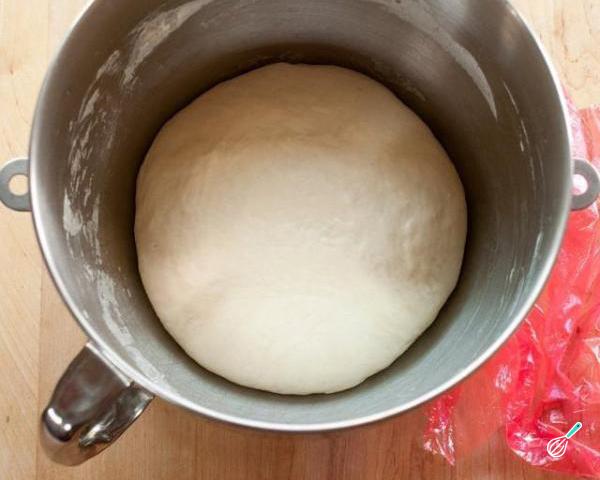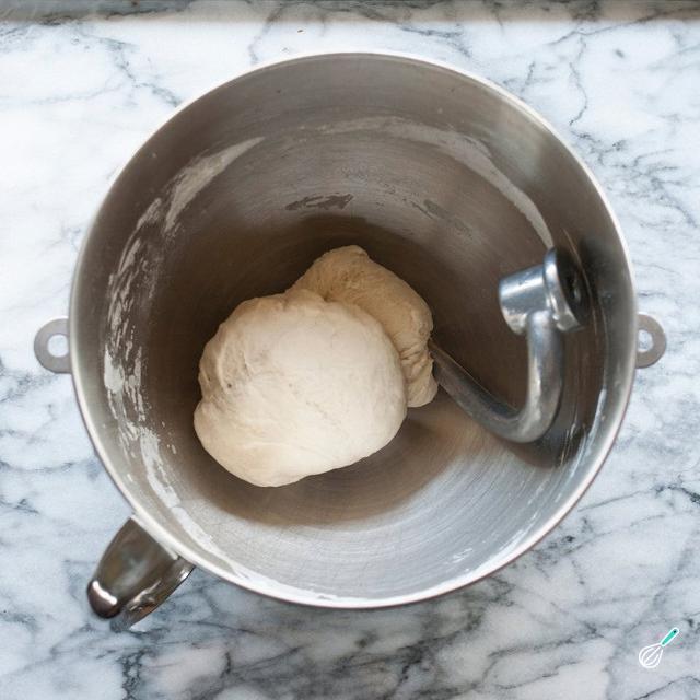 Em um bowl de uma batedeira planetária coloque os ingredientes secos: a farinha, o açúcar e o sal e misture. Acrescente o fermento e, usando o acessório para pão, misture em velocidade baixa por 8 minutos, até obter uma massa elástica e suave.