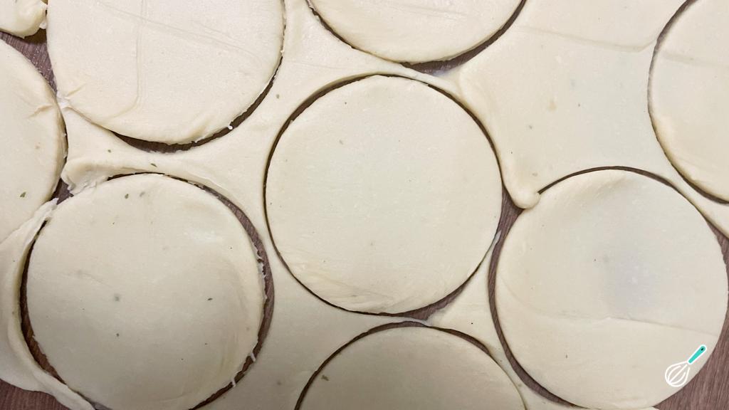 Abra a massa com um rolo, sem deixar muito fina, e corte em círculos da largura que preferir com a ajuda de um copo ou um cortador.