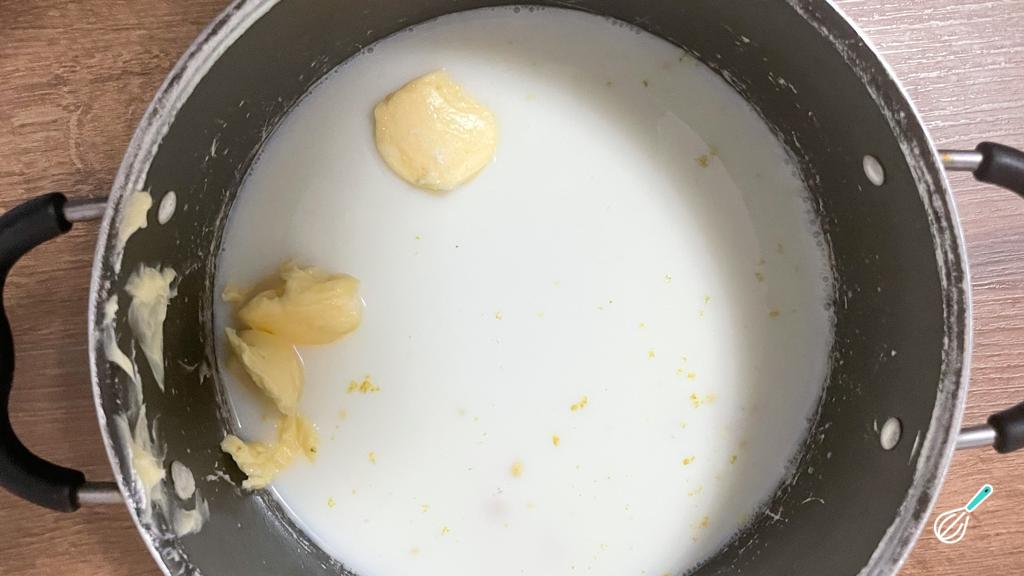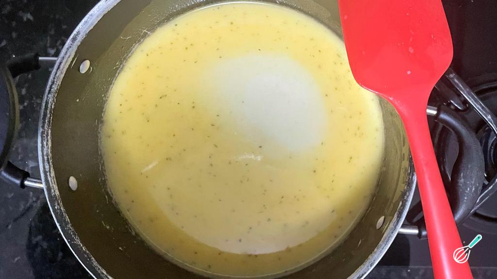 Leve ao fogo medio para aquecer até quase ferver, derretendo o caldo de legumes e a margarina.