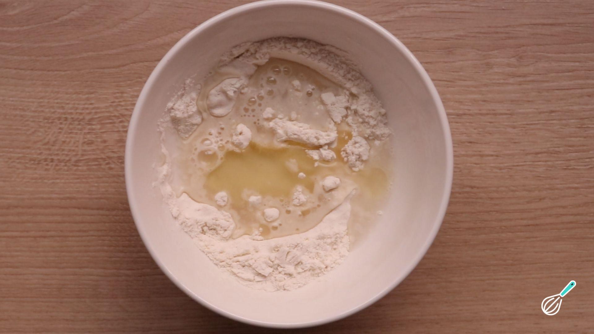 Despeje o óleo e metade da água morna e comece misturando com uma espátula.