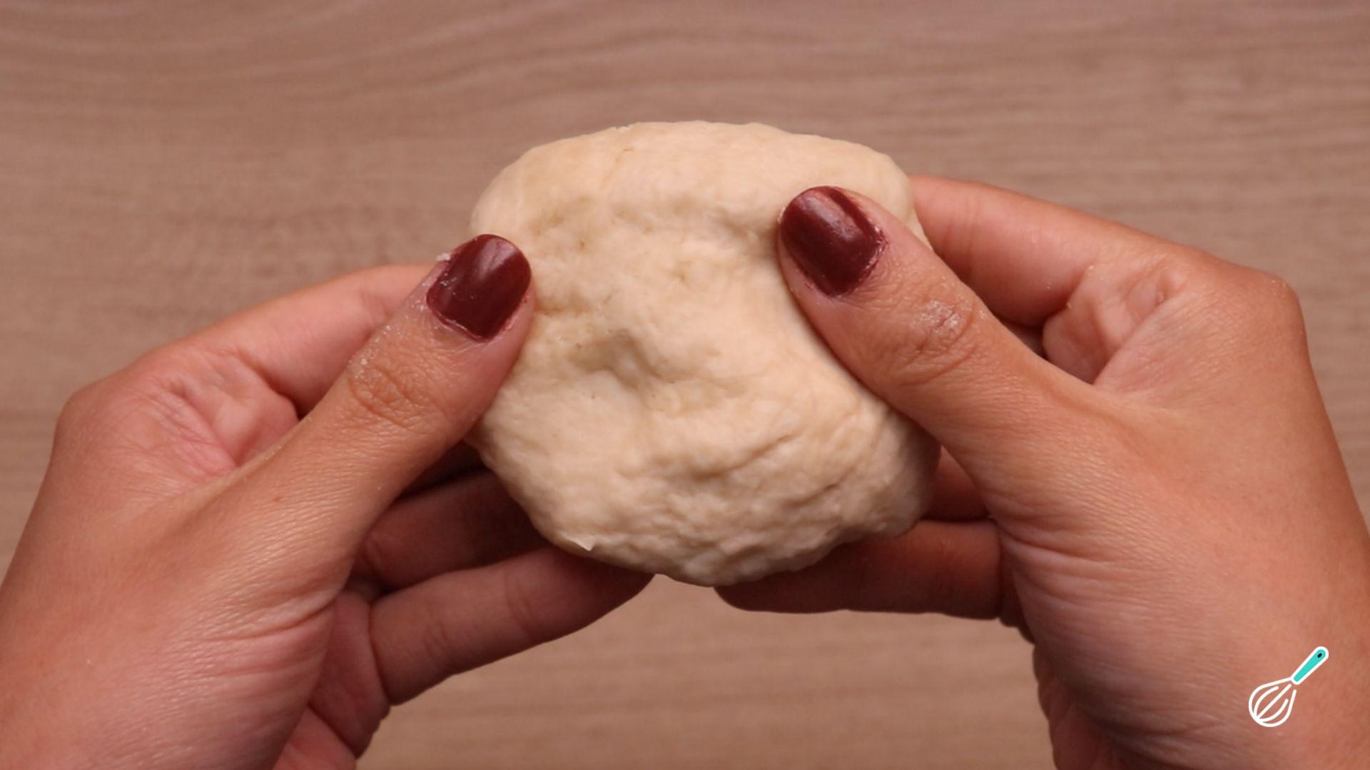 Em seguida misture com as mãos e sove a massa até ficar lisa. Deixe descansar por 15 minutos. Após esse tempo, enfarinhe levemente uma bancada e divida a massa em partes iguais. Faça uma bolinha com cada pedaço e abra com um rolo formando um disco.