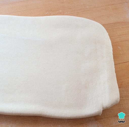 Neste momento, se a sua massa estiver numa bacia, transfira-a para a bancada da cozinha. Abra a massa com um rolo, conferindo-lhe um formato retangular, como na foto.