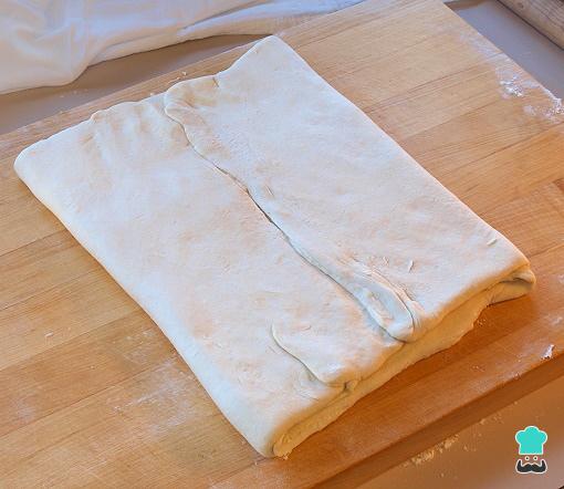 Volte a dobrar a massa do mesmo jeito que fez no passo anterior e abra novamente com o rolo. Repita esse procedimento por mais 1 ou 2 vezes para conseguir uma massa bem folhada!