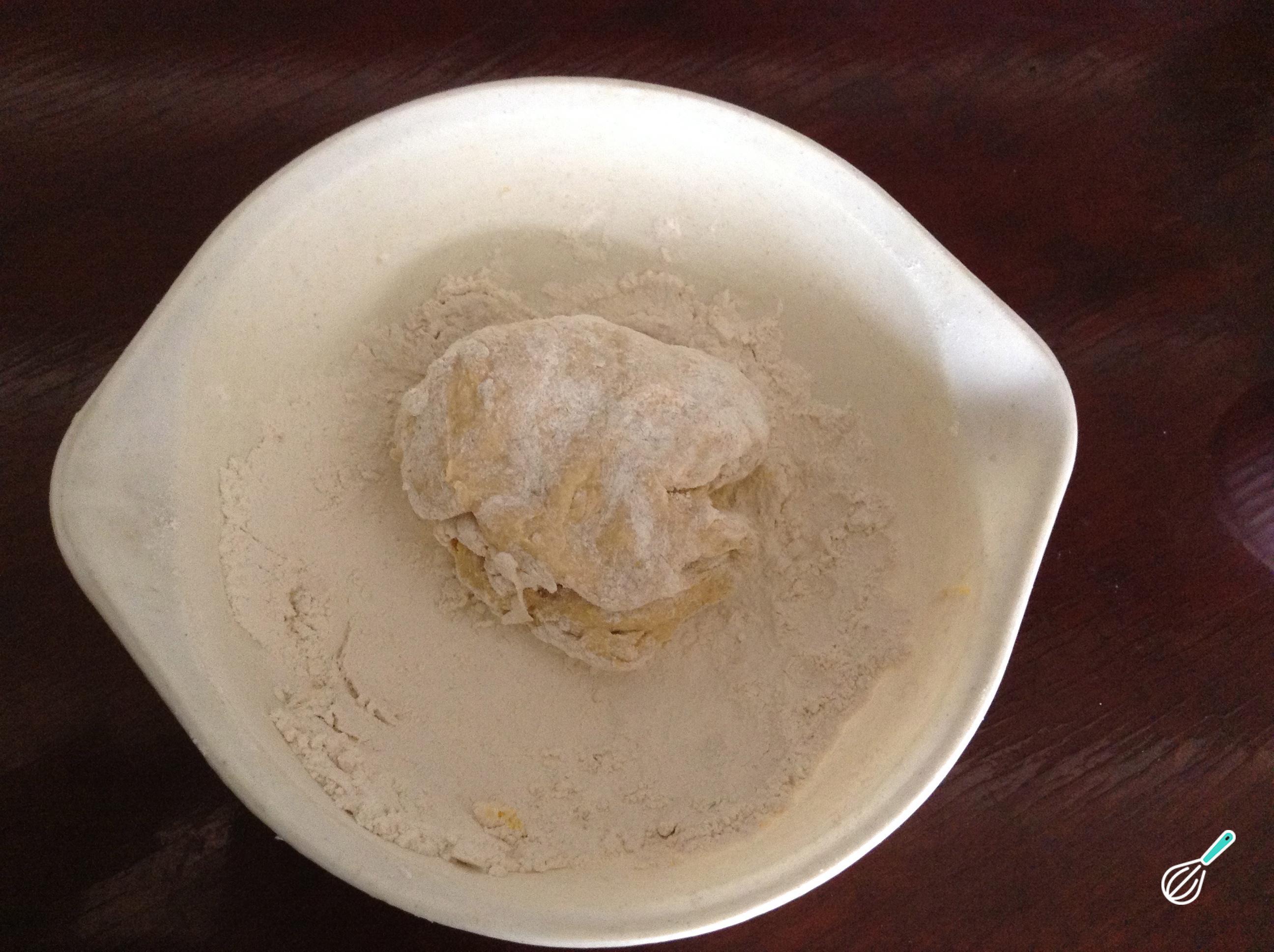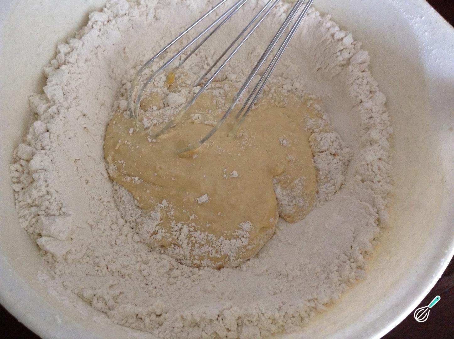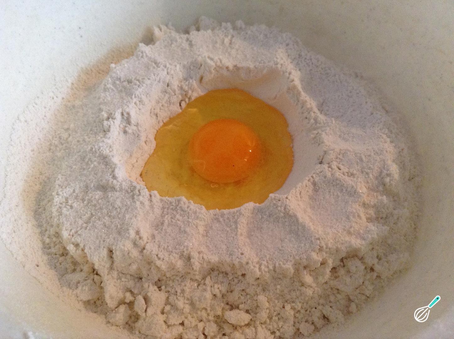 O passo seguinte da massa de quiche é colocar o ovo ao centro e, com a ajuda de uma espátula, envolvê-lo na farinha.