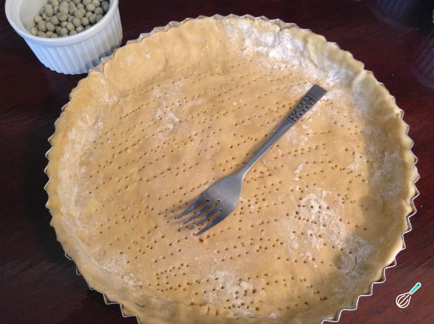 A massa de quiche está pronta! Para assar, fure a base com um garfo, para que o ar penetre nela e asse de forma mais homogênea, e cubra com papel alumínio e algumas leguminosas, de forma a conferir peso e evitar que ela suba.