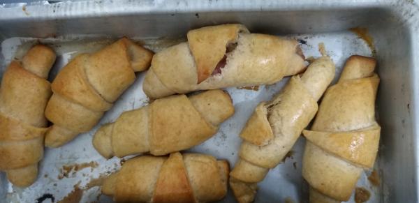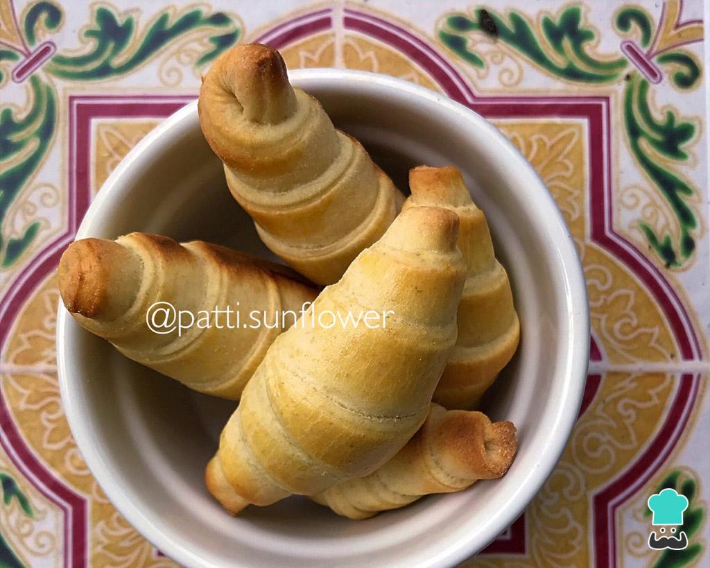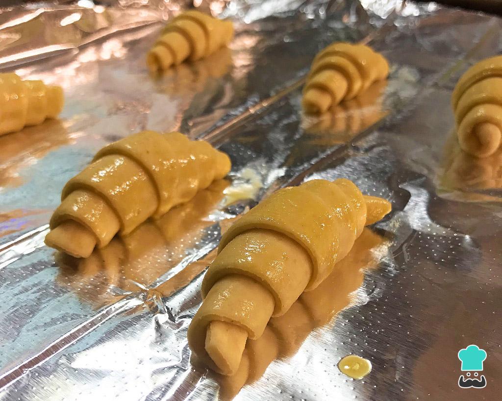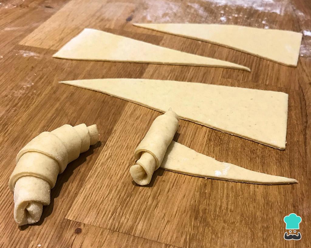 Enrole os triângulos começando pelo lado reto e finalizando pela ponta, como na foto (quase como um croissant).