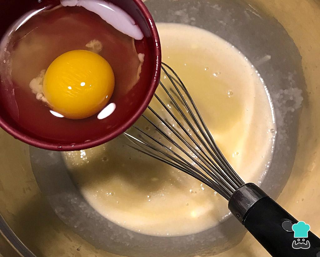 Na vasilha com o fermento misture o restante do açúcar, o leite morno com a manteiga, o sal e o ovo. Mexa bem para misturar completamente.