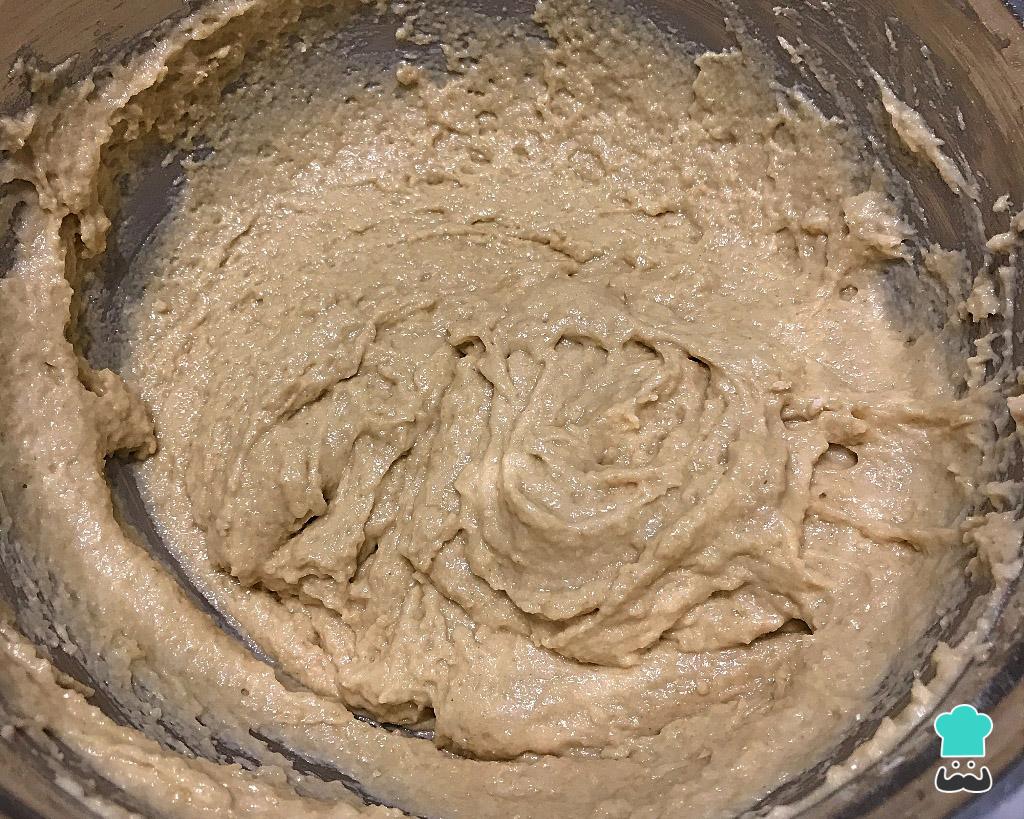 Adicione na mistura a farinha de trigo integral e 1 xícara da farinha de trigo branca. Mexa com uma colher de pau, até ficar na consistência igual à da foto.