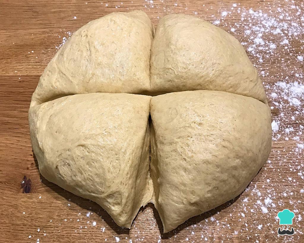 Após esse tempo, polvilhe a superfície de trabalho com farinha, coloque a massa e aperte bem para tirar o ar.