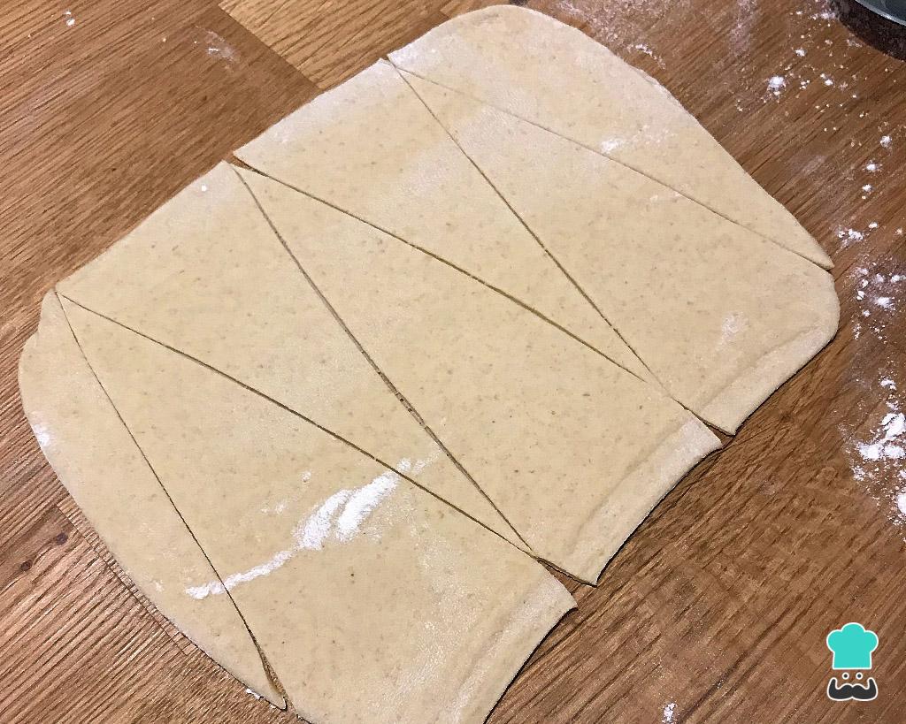 Hoje vou dar uma opção simples para usar essa massa: um pãozinho para comer no chá da tarde ou na café da manhã, sem recheio nenhum, apenas prontinho para receber uma manteiguinha ou ir direto para a boca sem mais nada mesmo. Para começar abra a massa no formato de um retângulo e corte em triângulos.