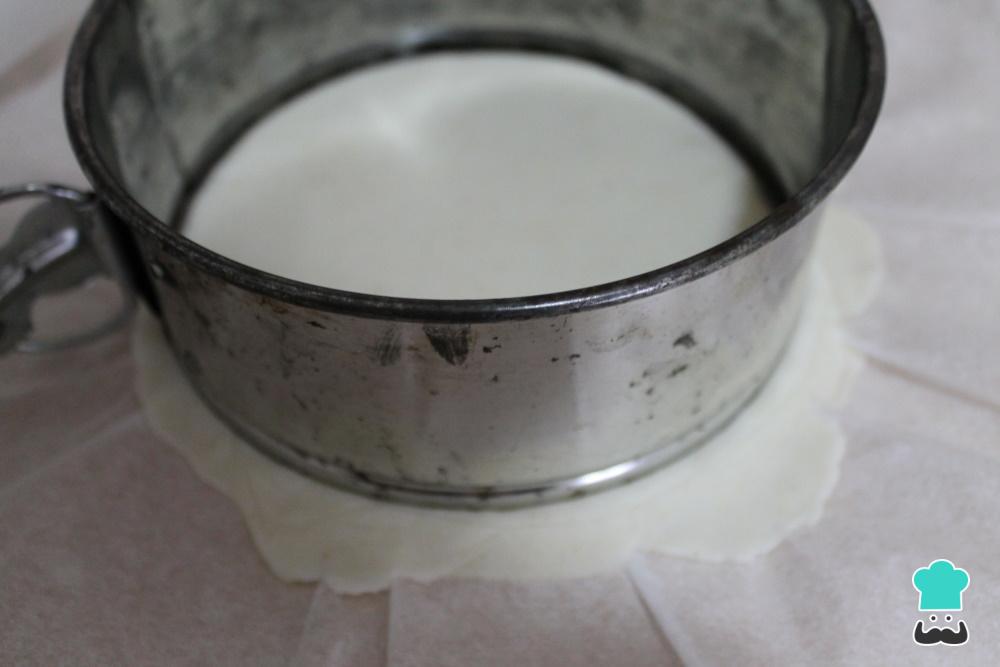 Retire o papel de cima da massa e corte com um disco grande ou usando uma forma de bolo redonda, como na foto.