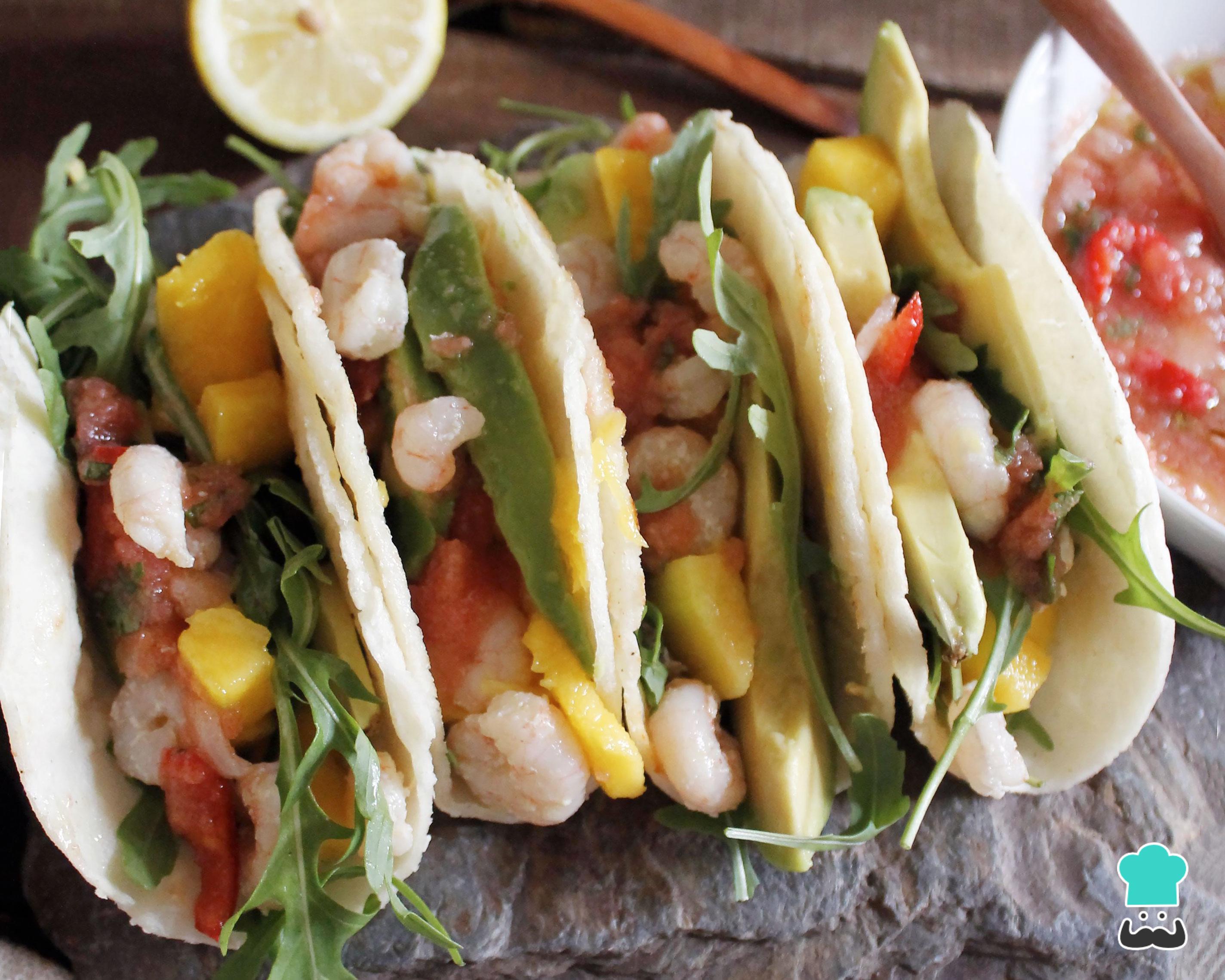 Depois é só montar os tacos com os ingredientes da sua preferência! Neste caso escolhi milho verde, abacate fatiado, rúcula, vinagrete pico de gallo, camarão cozido e manga.
