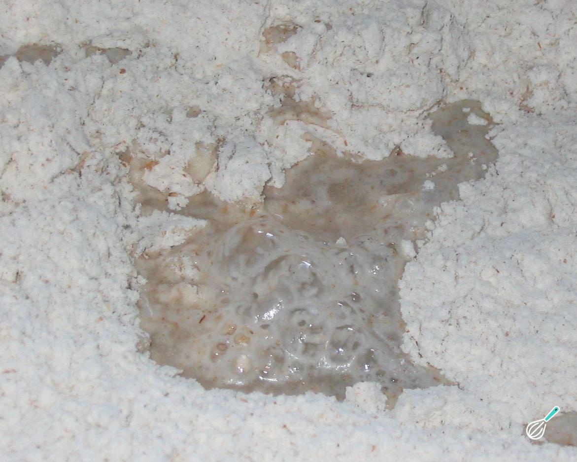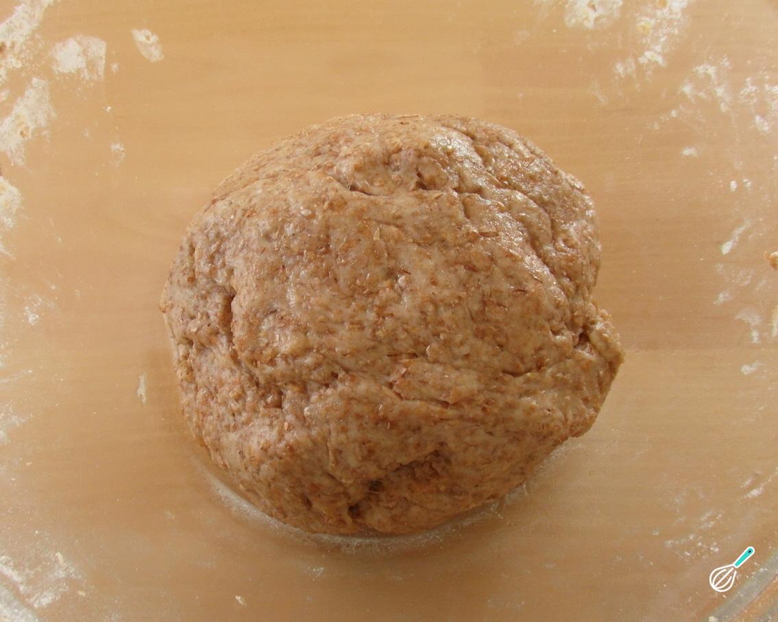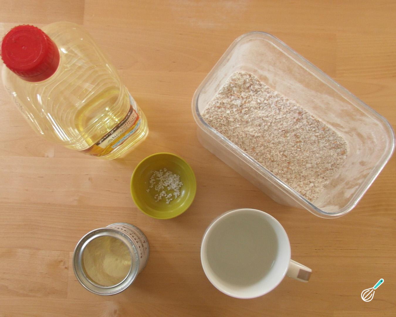 Misture os ingredientes secos (trigo, fermento e sal) em uma tigela e adicione o óleo e a água. Misture muito bem com as mãos ou com uma colher até obter uma massa lisa, homogênea e consistente.