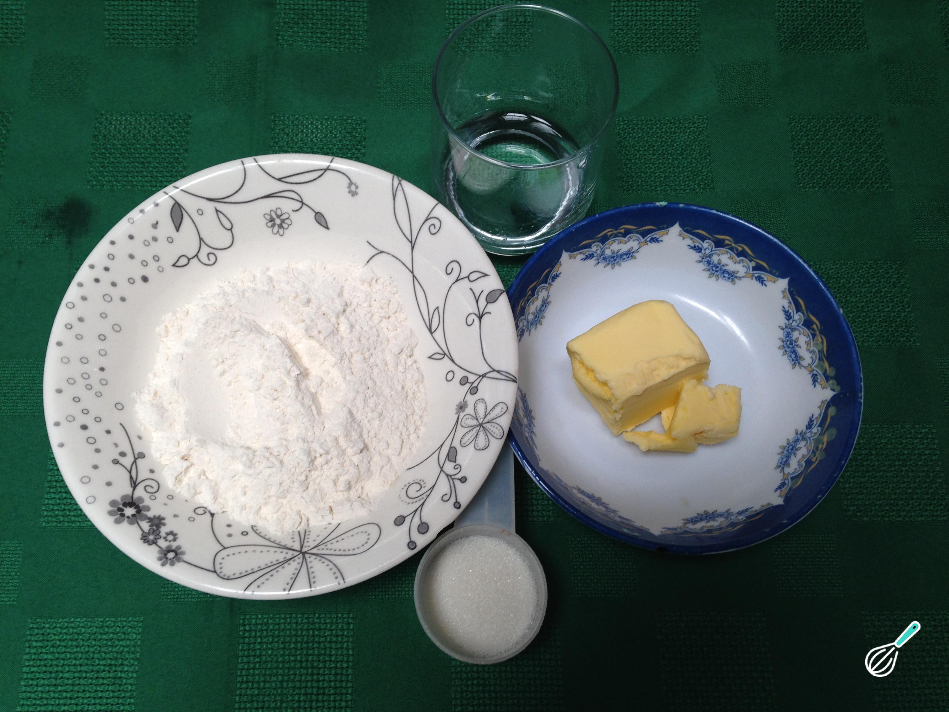 Para fazer esta massa podre doce, o primeiro passo é reunir os ingredientes. As quantidades indicadas servem uma forma de tamanho médio.