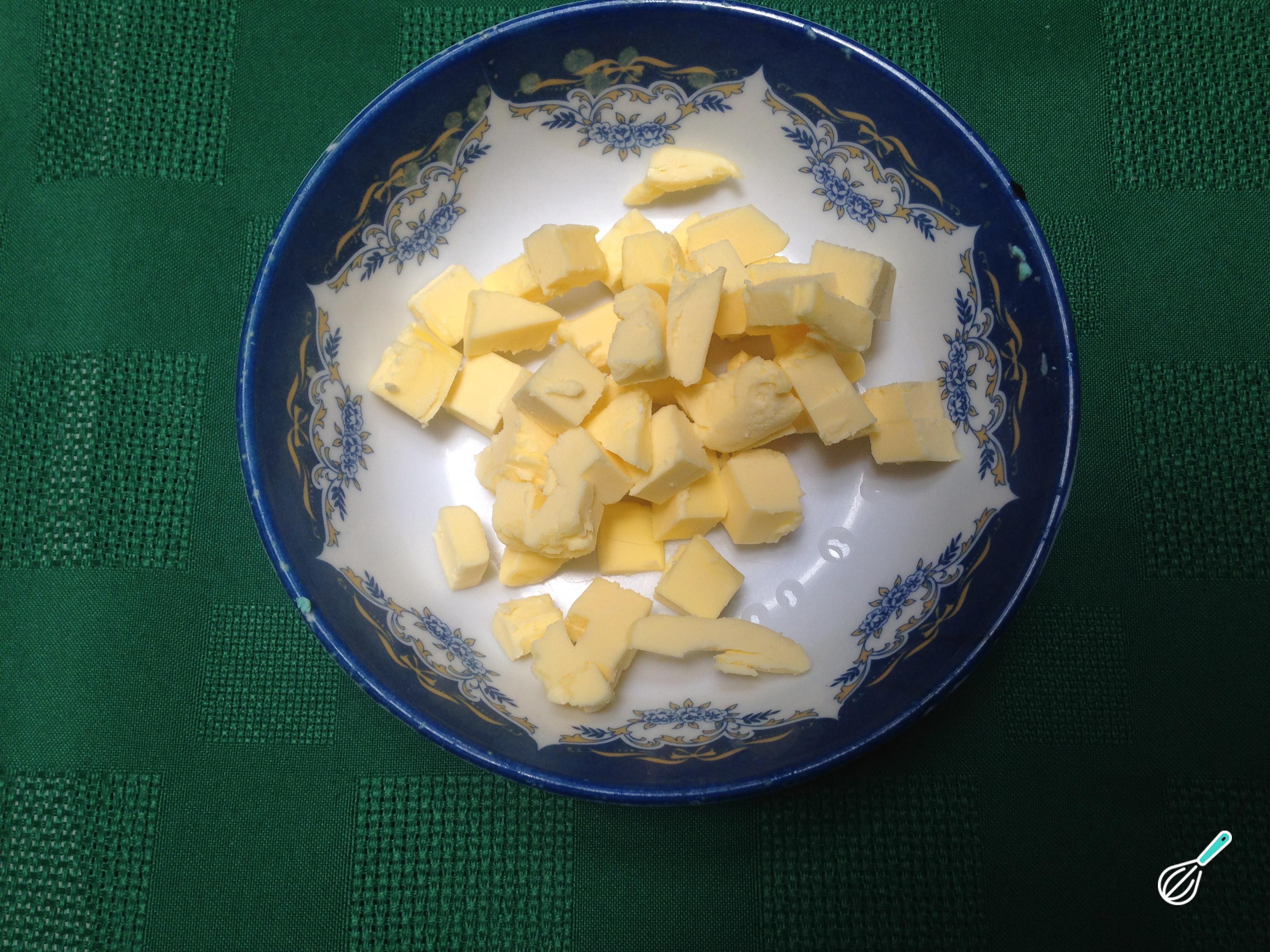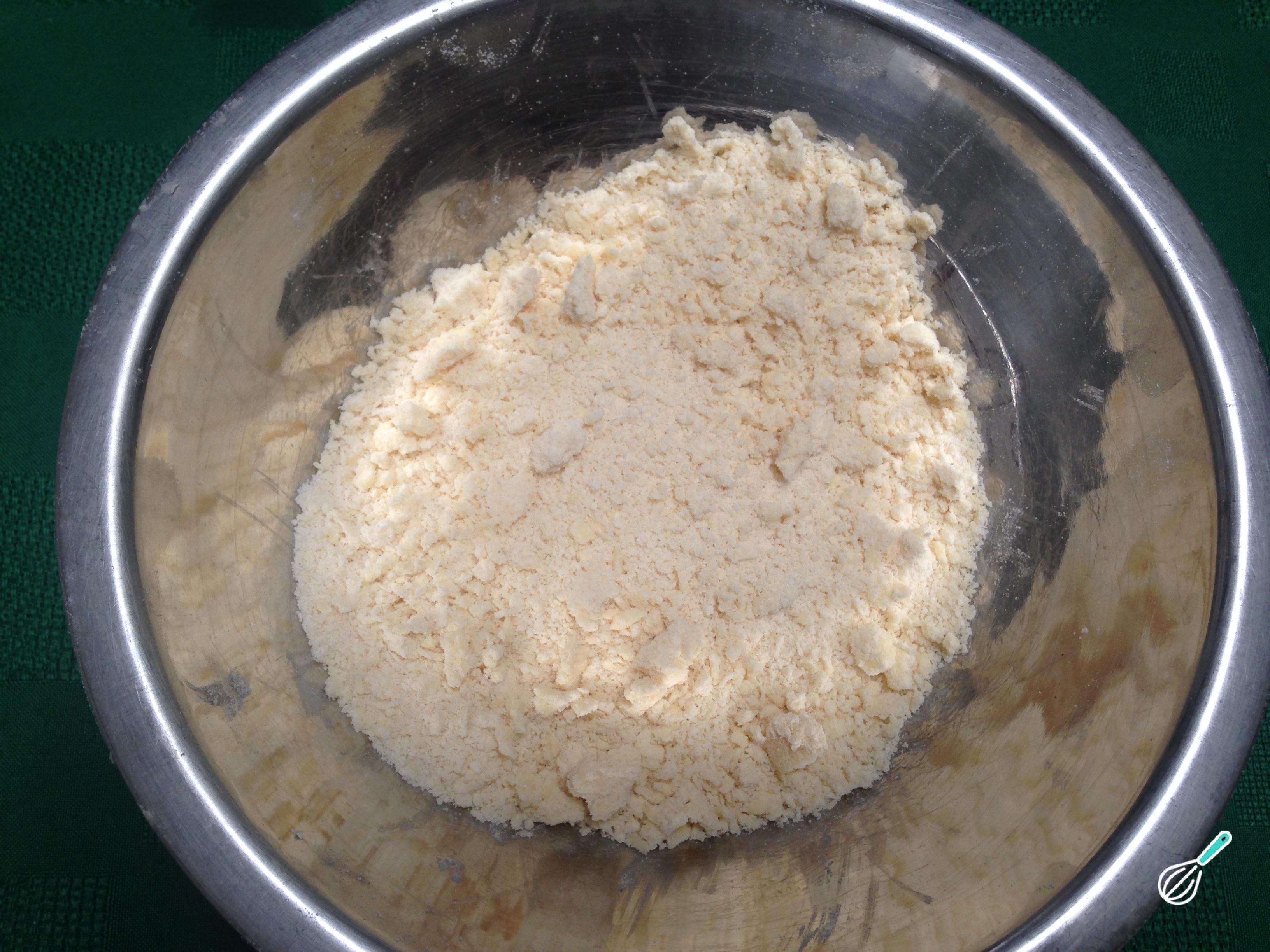 Adicione a manteiga cortada em pedaços e pique com uma faca, de forma a formar uma consistência tipo areia.