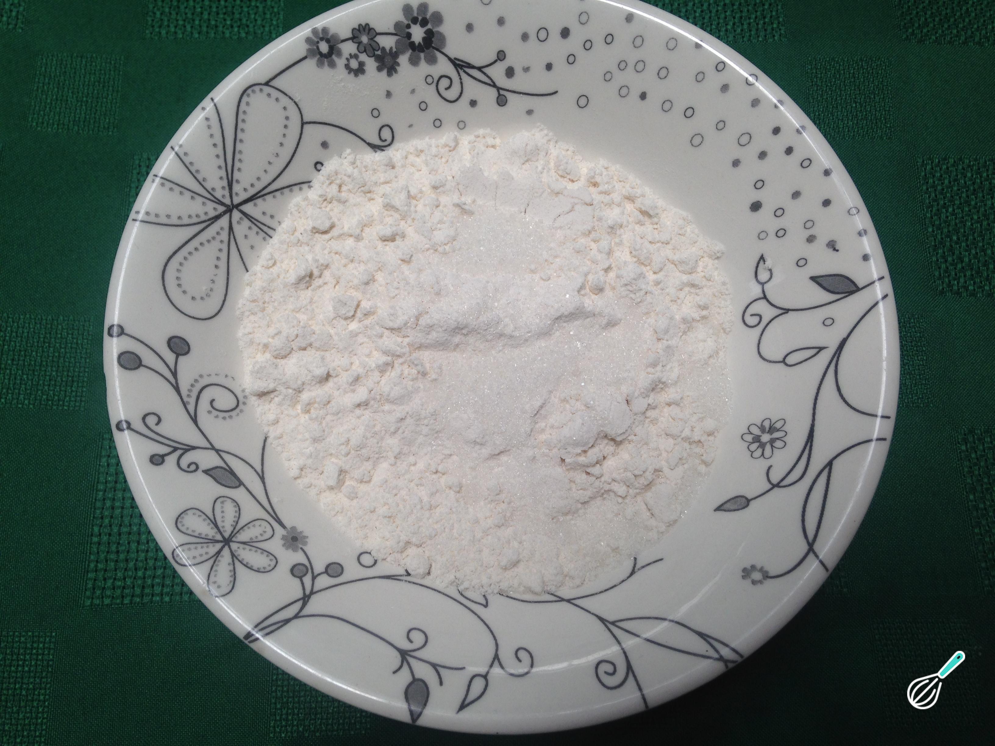 O passo seguinte desta receita de massa podre doce é misturar a farinha com o açúcar em uma tigela.