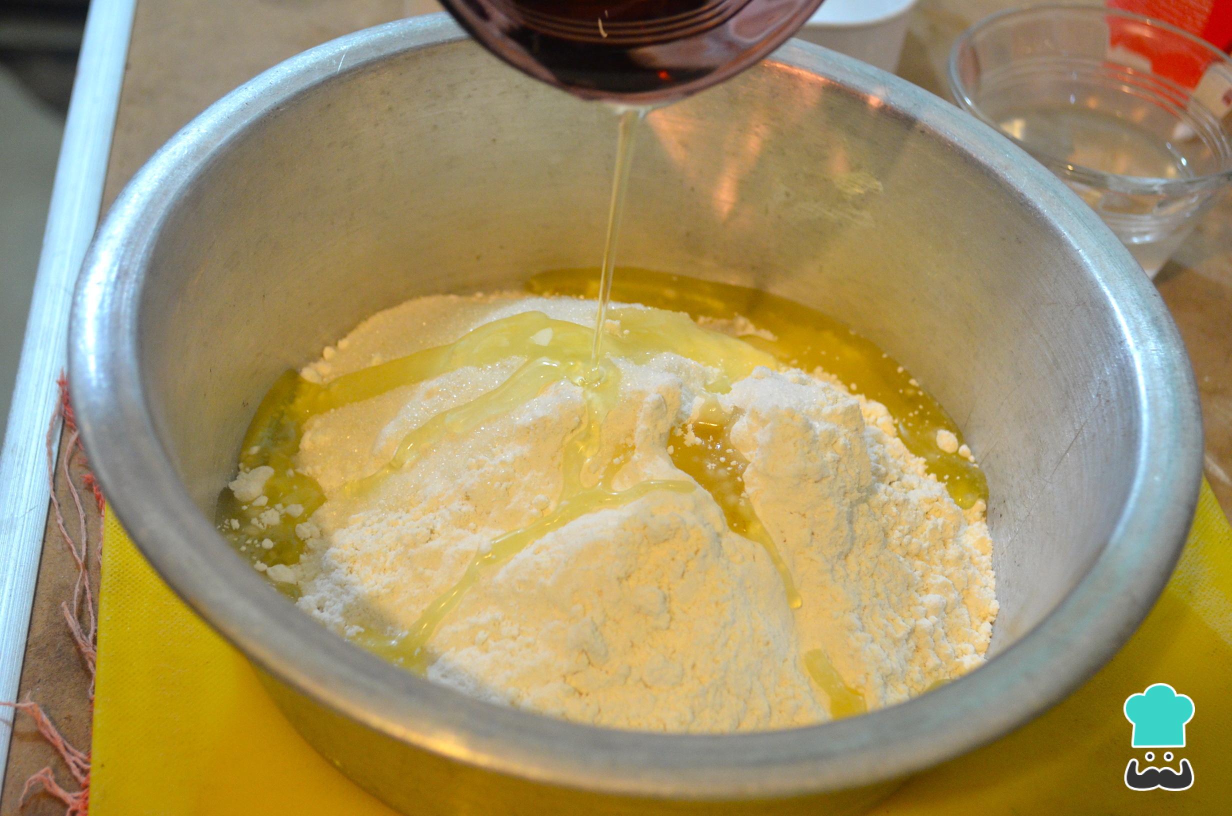 Para começar esta receita de massa para torta salgada, peneire a farinha em um bowl e adicione o azeite, o açúcar e o sal.