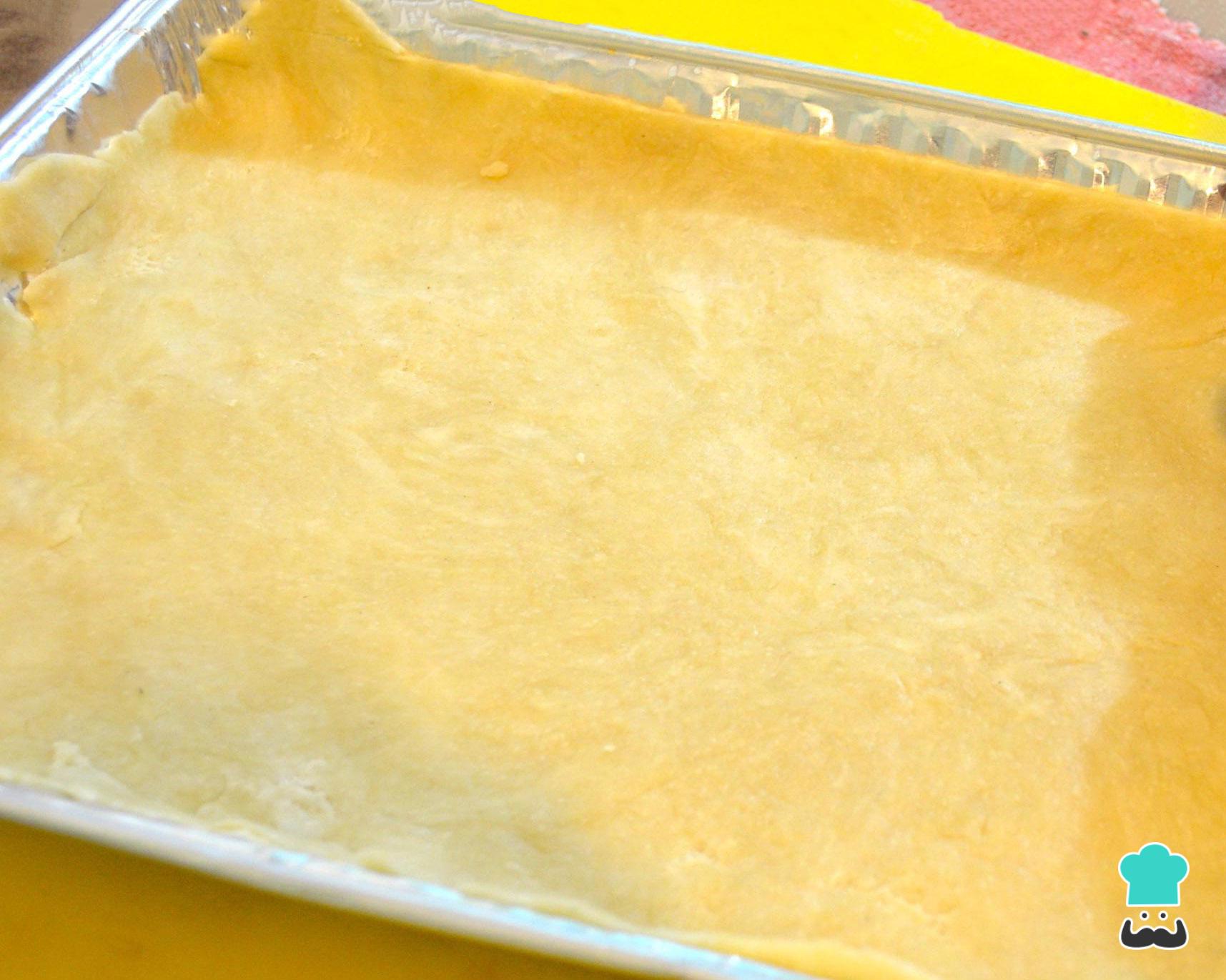 Após o tempo indicado, abra a massa com os dedos diretamente na forma untada, deixando-a uniforme (esse processo demorará uns 10 minutos). Pique o fundo um com garfo, apare o excedente e coloque pré-assando no forno nos 180ºC por 10-15 minutos.