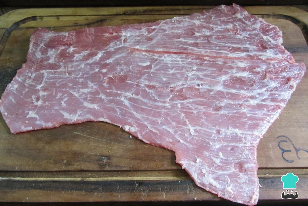Enquanto os ovos cozem abra a peça de matambre e, com uma faca afiada, retire o máximo de gordura que conseguir. O ideal é que fique como na fotografia.
