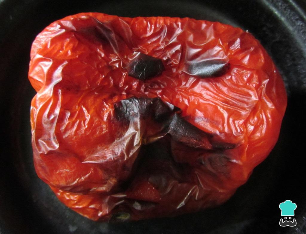 Prepare os legumes: asse o pimentão no fogo direto até ficar ligeiramente queimado, assim será mais fácil pelar. Retire o máximo de pele que conseguir e corte em tiras.