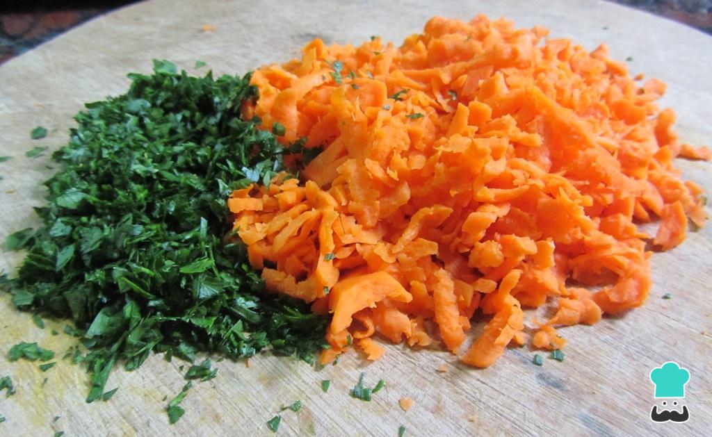 Tempere a carne com a pimenta caiena ou chili moída, a pimenta do reino e os oréganos. Polvilhe a salsinha, a cenoura e o queijo e disponha o pimentão e os ovos descascados como na fotografia.