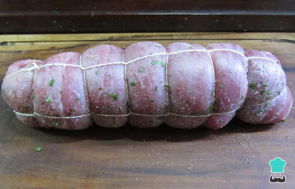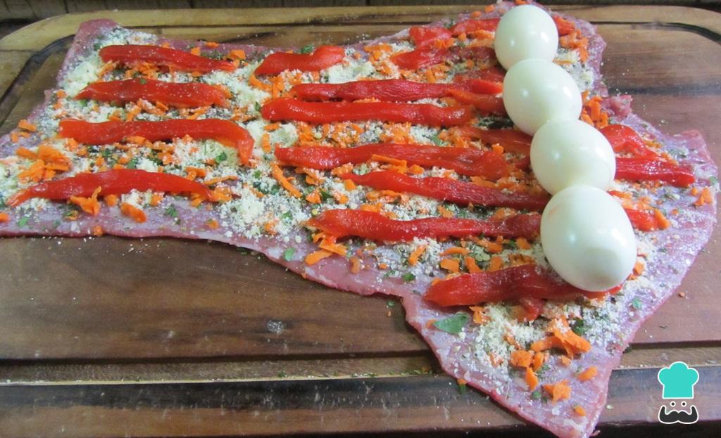 Depois do passo anterior comece enrolando o matambre pela extremidade onde tem os ovos, apertando firmemente para que os ingredientes não escapem. No final amarre com fio barbante.