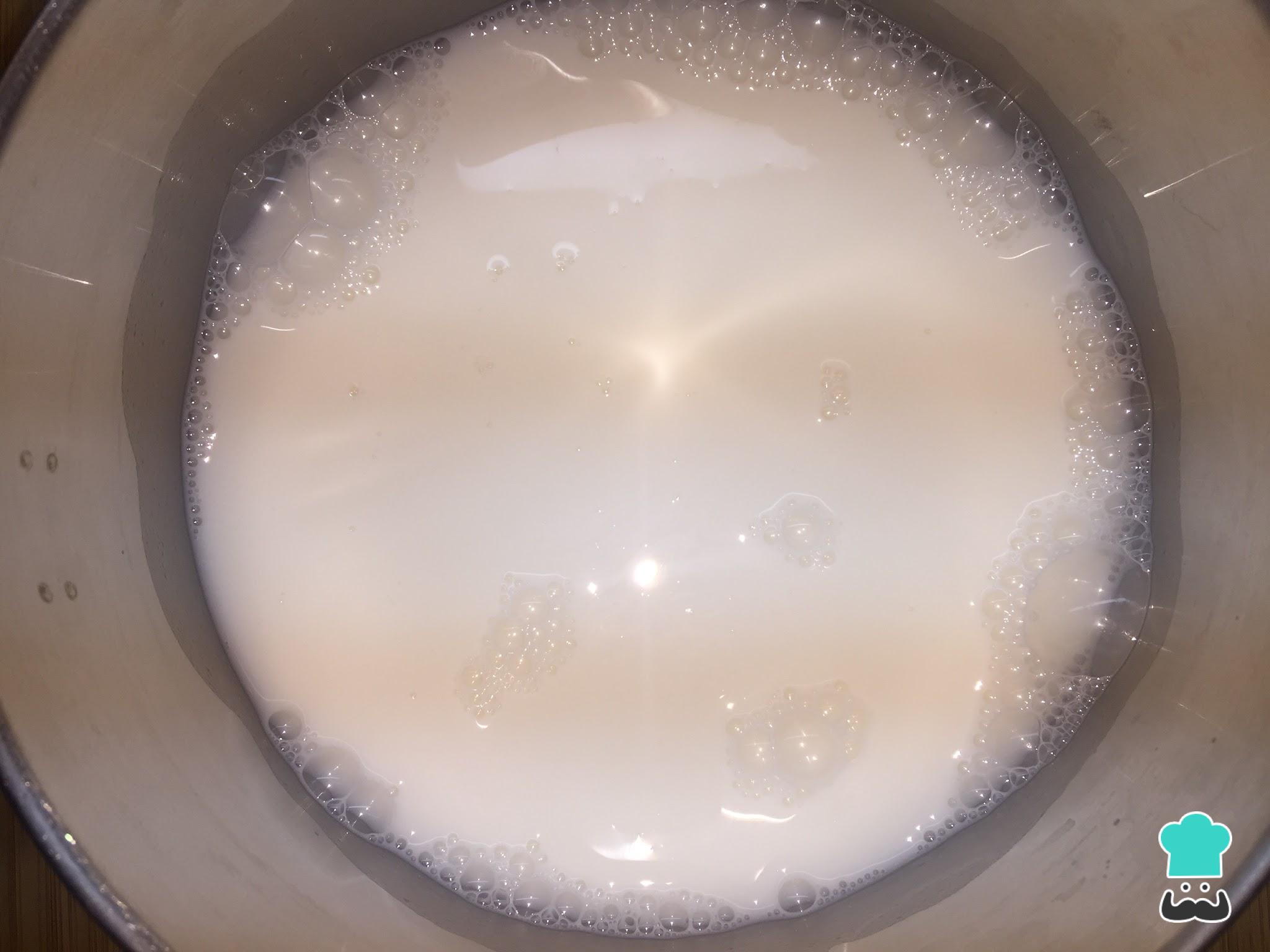Comece por colocar o leite de amêndoa em uma panela. Leve ao fogo para amornar. Se preferir pode aquecer no microondas.