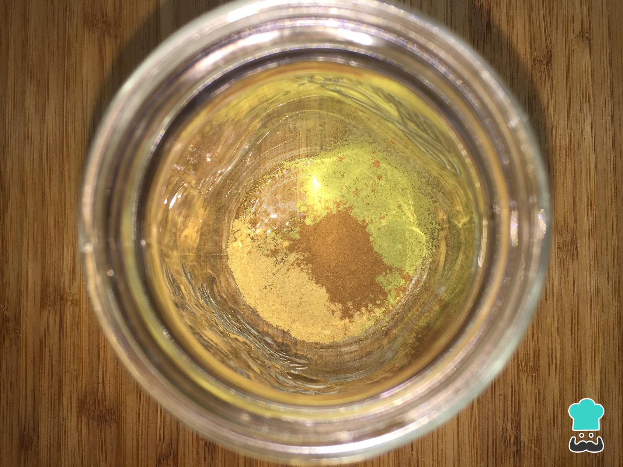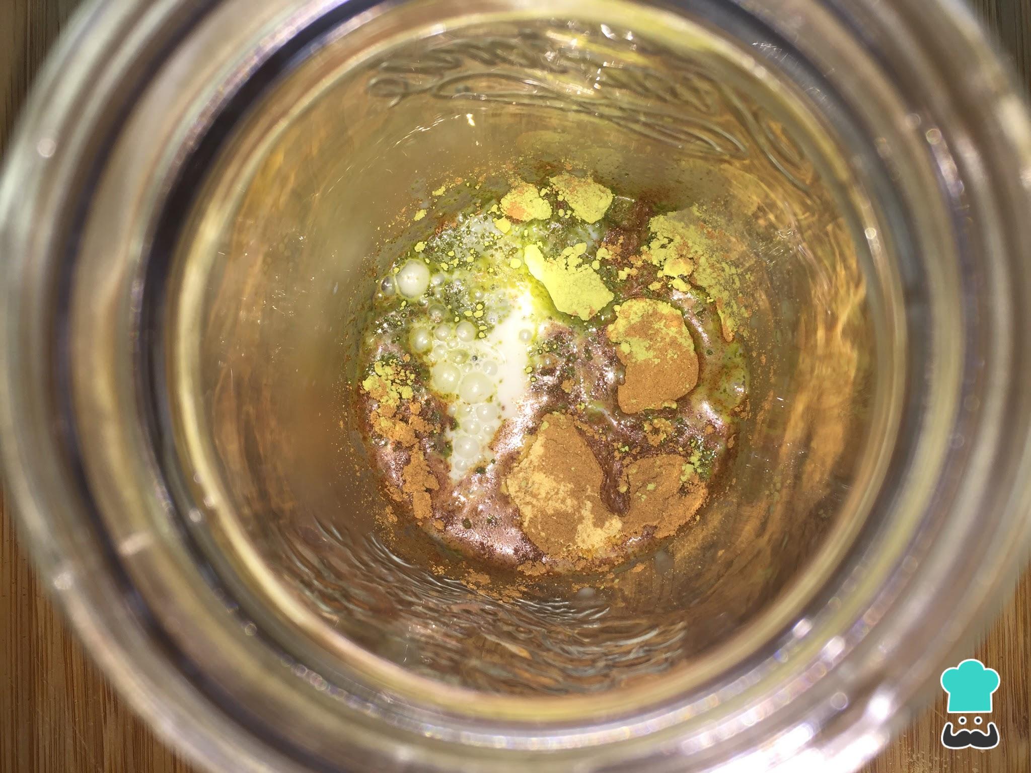 Em um recipiente, coloque a matcha, o gengibre em pó, a canela em pó e misture.