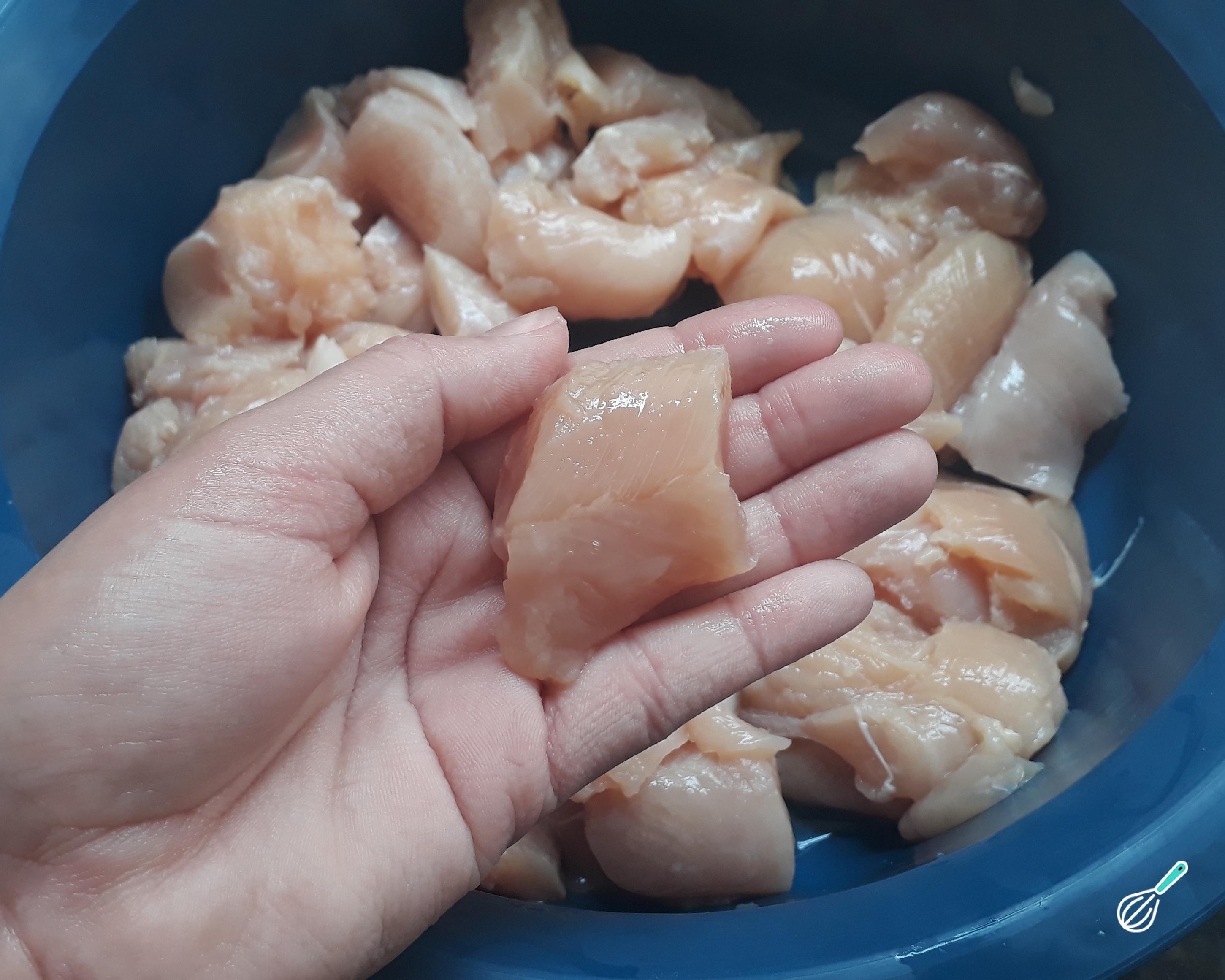 Corte o peito de frango em cubos grandes, como mostra a imagem. Desse jeito será bem fácil preparar esse medalhão de frango com bacon.