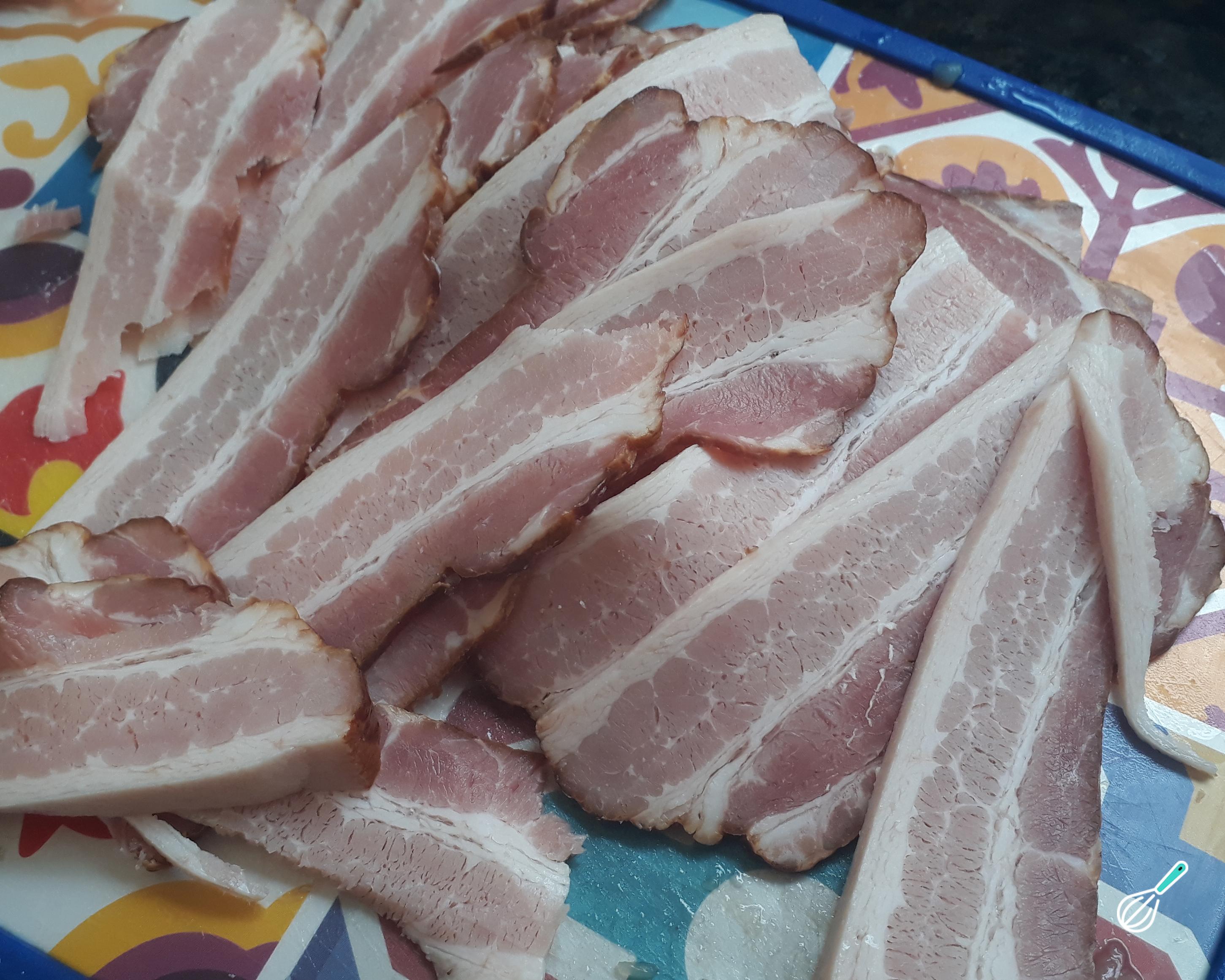 Compre uma peça de bacon com cerca de 15 a 20 cm de comprimento e corte o bacon em fatias finas, como mostra a imagem. Você também pode usar bacon fatiado mas, nesse caso, as fatias poderão ser mais curtas.
