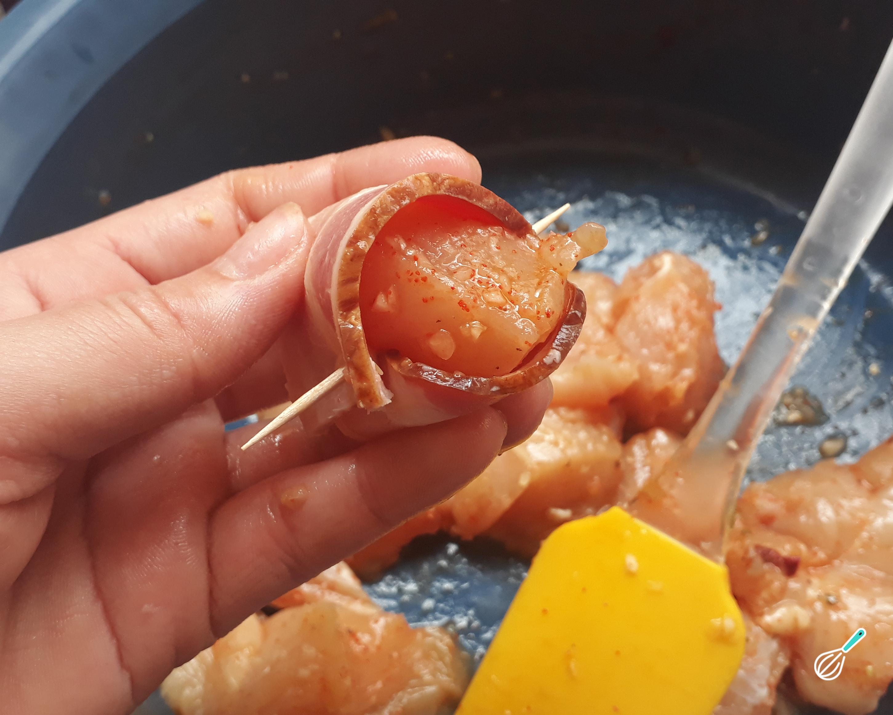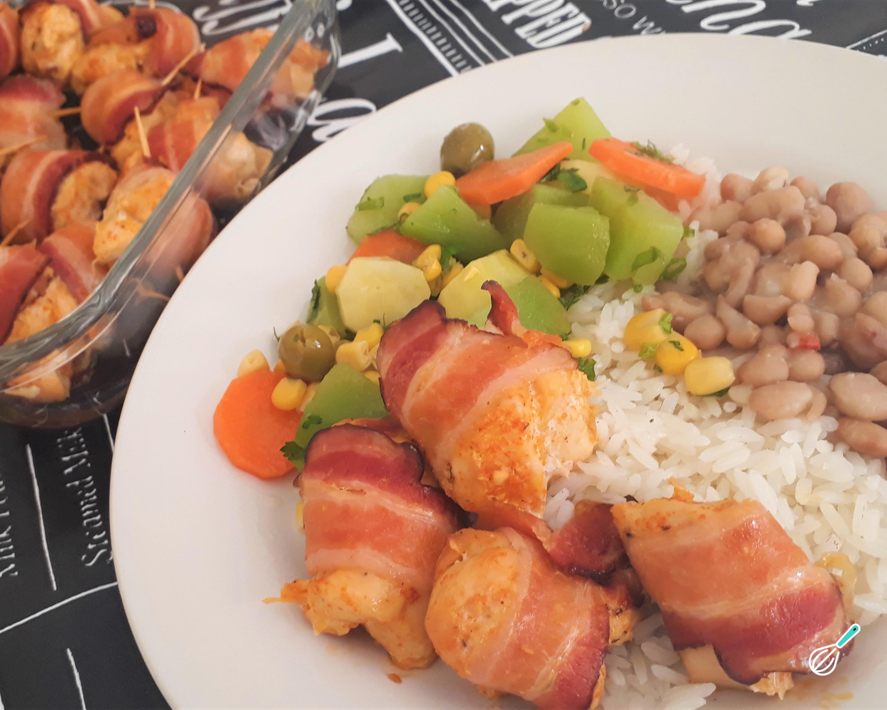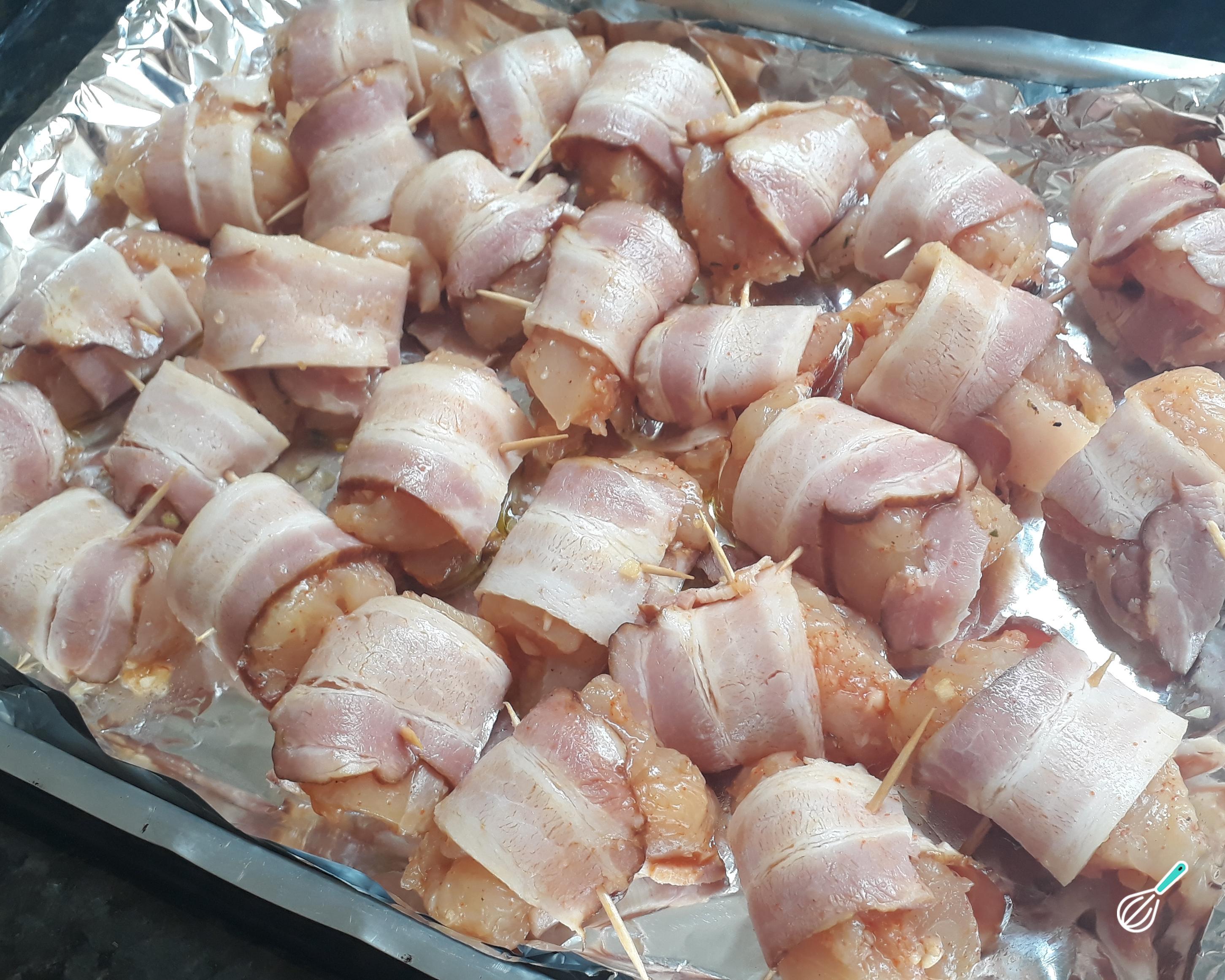 Dica: A quantidade de fatias de bacon deverá ser a mesma que a quantidade de cubinhos de frango.