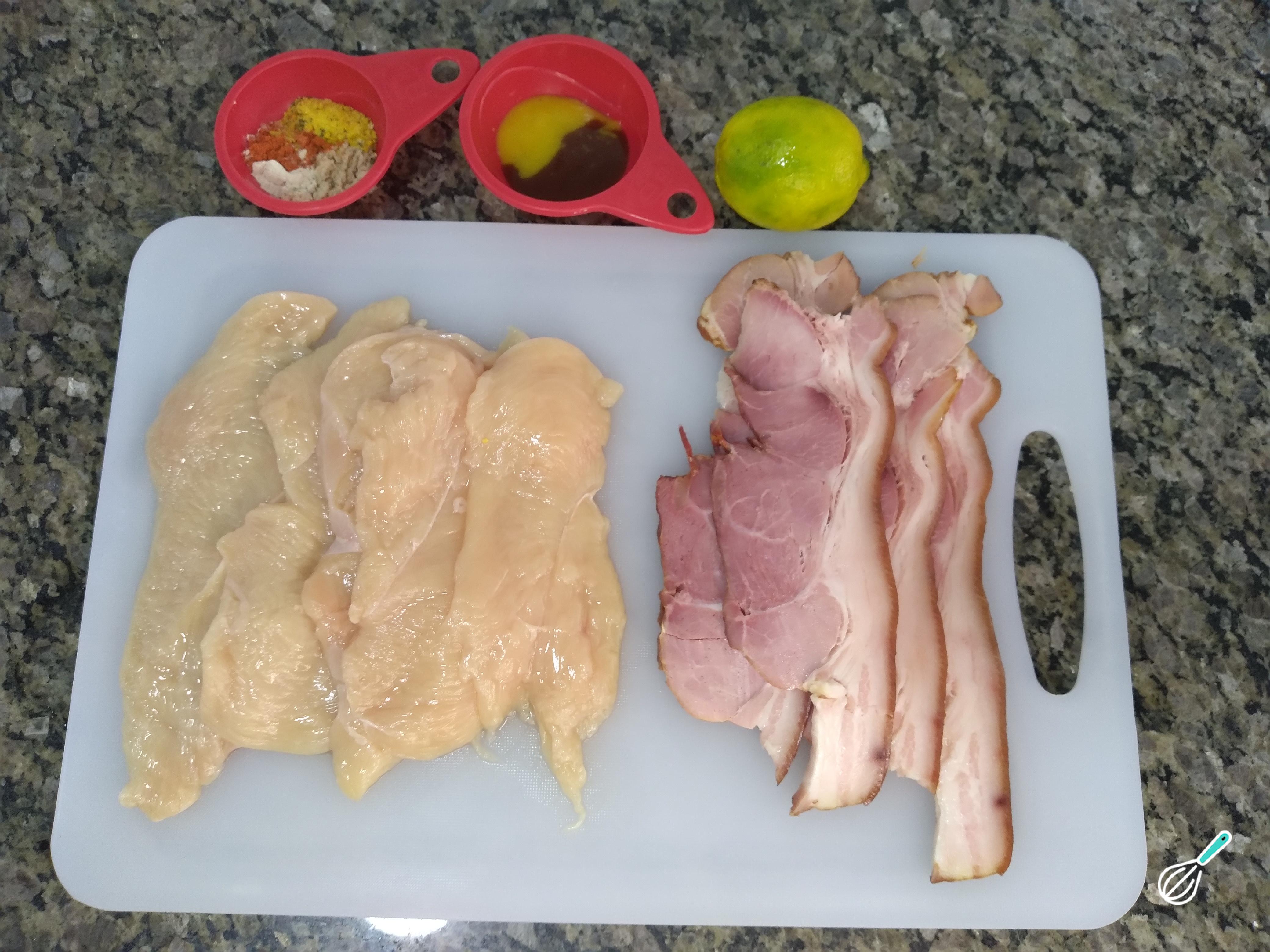 Comece cortando o peito de frango em bifes finos e separando os demais ingredientes para o preparo do medalhão de frango com bacon.