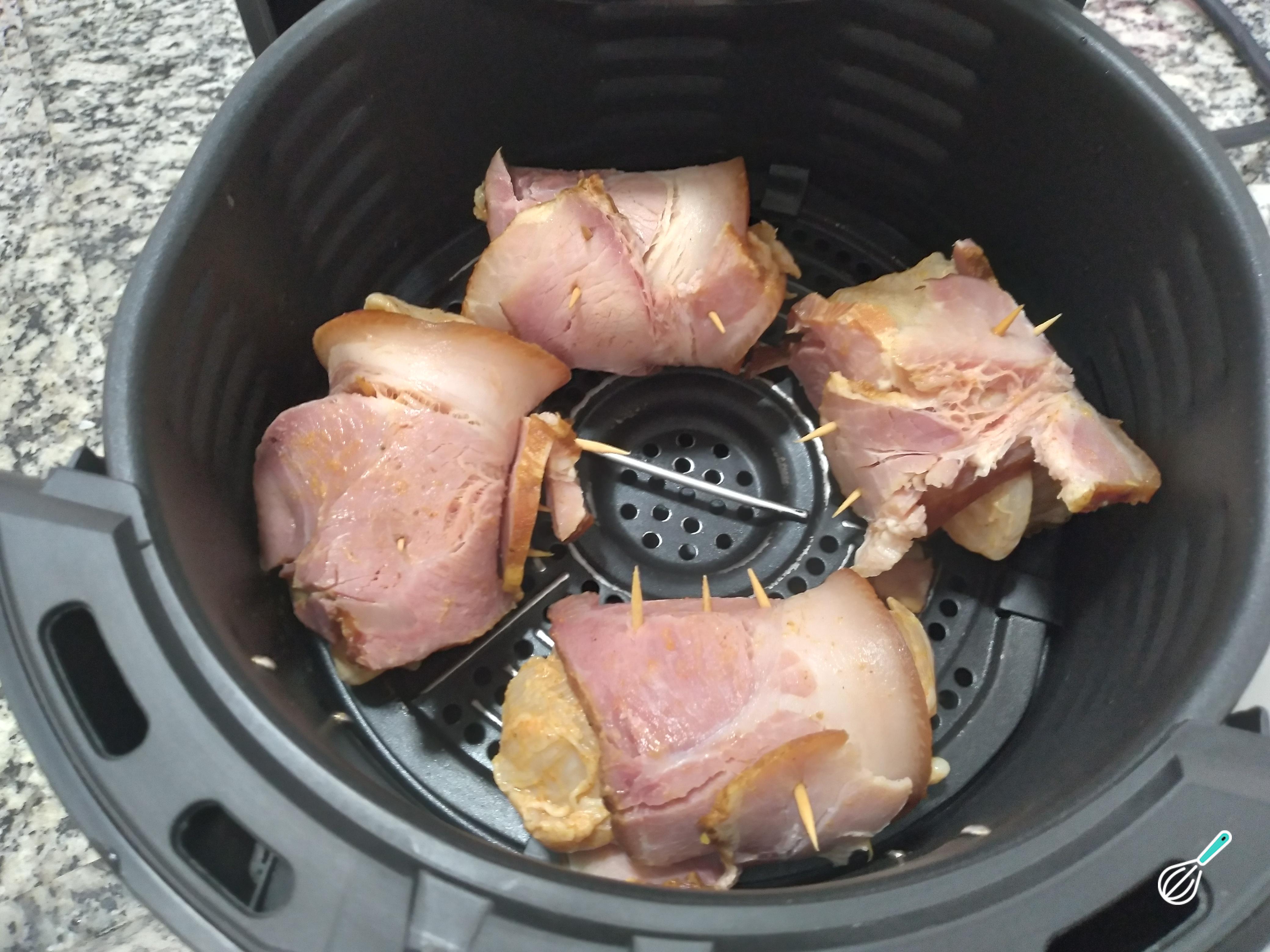 Com os medalhões devidamente enrolados, coloque na airfryer para assar primeiro a 160 graus por 20 minutos, passado esse tempo, coloque novamente por mais 10 minutos a 200 graus. Esse procedimento garante que asse por completo sem ressecar. Dessa forma ficará perfeito!