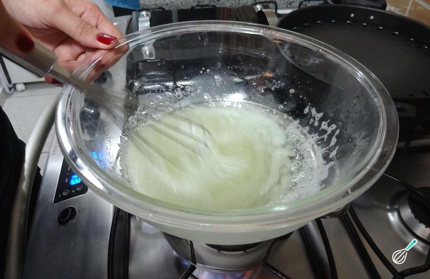Para preparra merengue com chantilly e morango, comece por preaquecer o forno a 180 º C. Misture as claras e 12 colheres de açúcar em um recipiente e leve ao fogo em banho-maria, misturando constantemente.