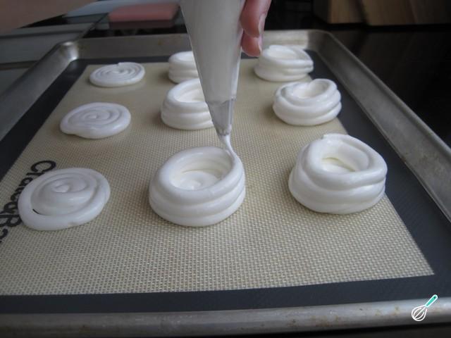 De seguida, bata a mistura na batedeira até se formarem picos firmes. Transfira para um saco de confeiteiro e faça os merengues sobre uma assadeira forrada com papel manteiga. Asse os merengues no forno, deixando a porta entreaberta, até dourarem.