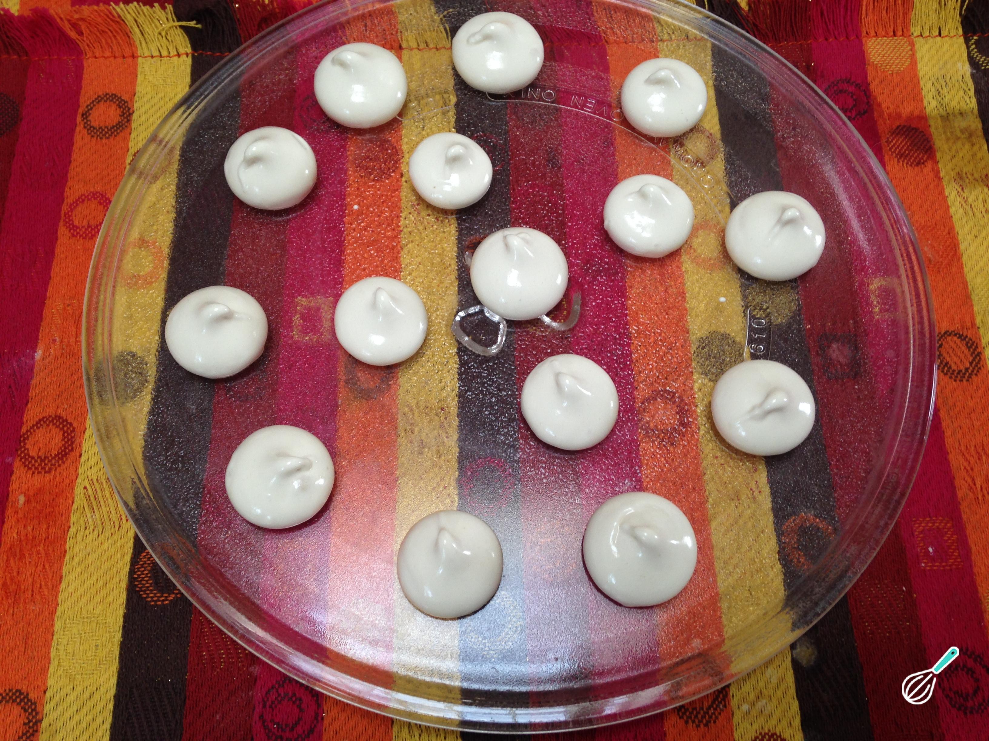 Com uma manga de confeiteiro, forme merengues em um prato que possa ir ao forno. Asse a 100ºC por 25 minutos, ou até que estejam durinhos.