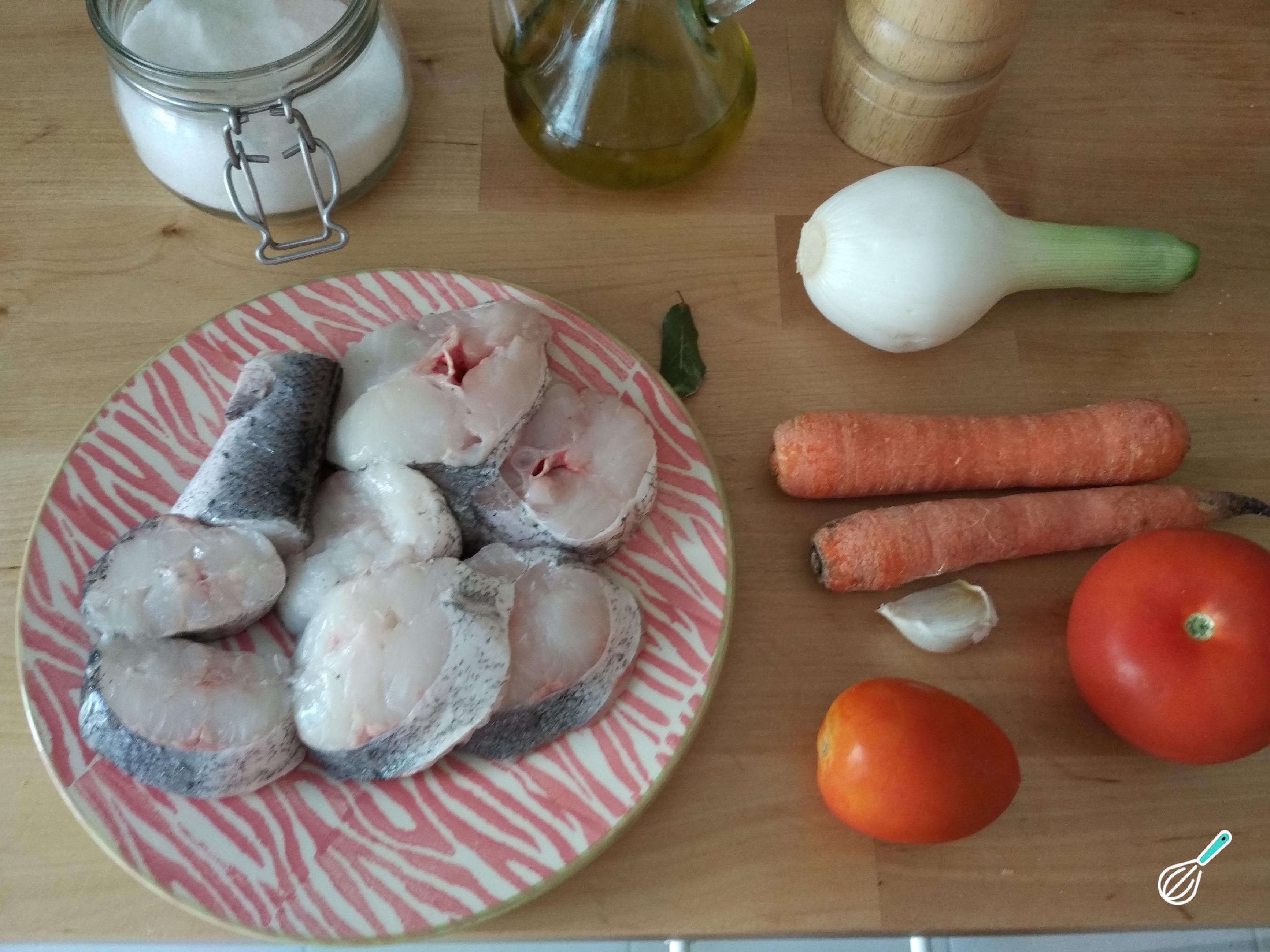 Primeiramente reúna todos os ingredientes desta receita de merluza ao molho de cenoura. Tempere o peixe com sal e pimenta a gosto e reserve.