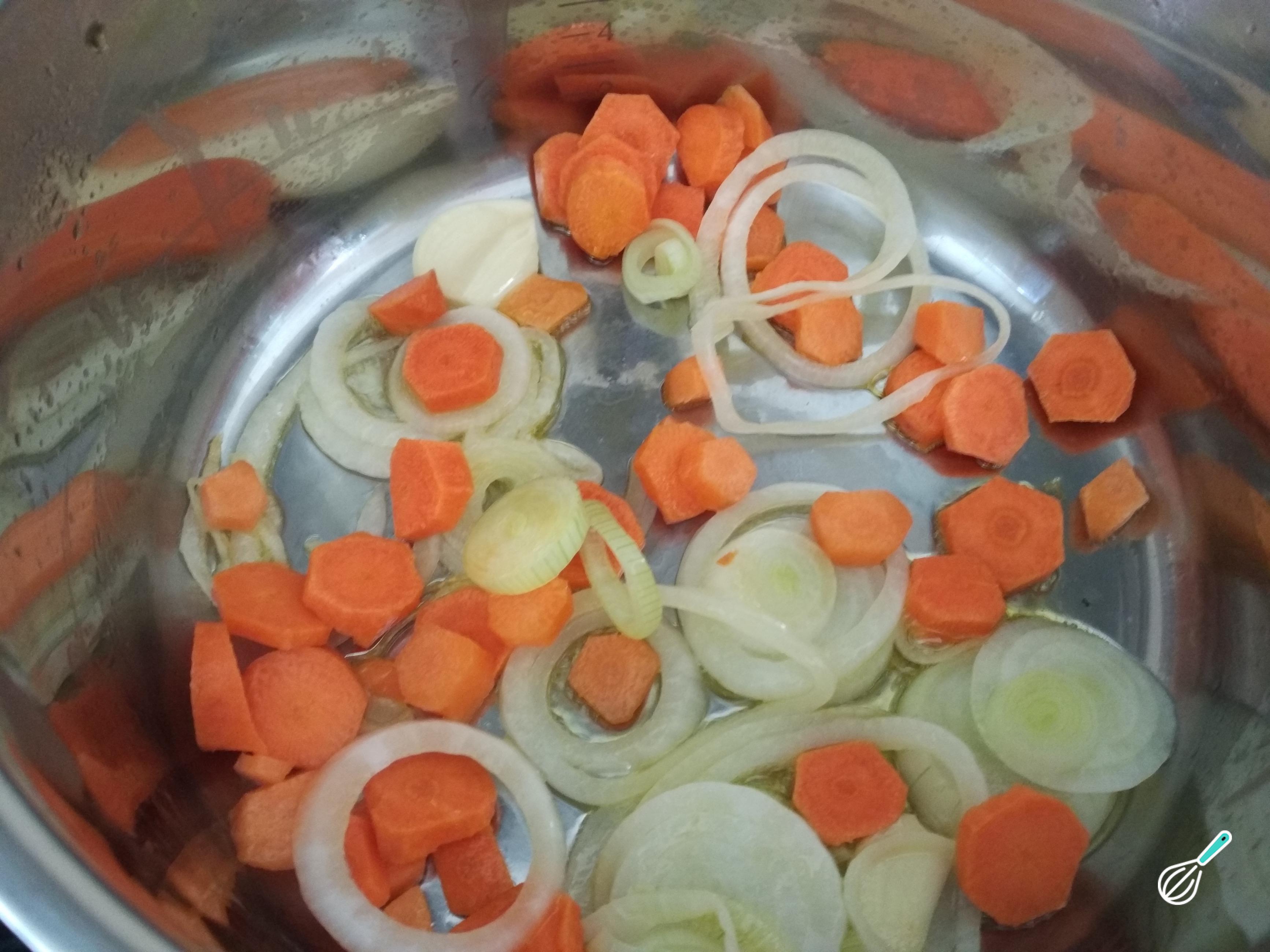 Comece preparando o molho de cenoura: leve ao fogo médio uma panela com o azeite, a cebola e as cenouras cortadas em rodelas finas. Deixe refogar por 2 minutos, mexendo de vez em quando, até a cebola ficar transparente.