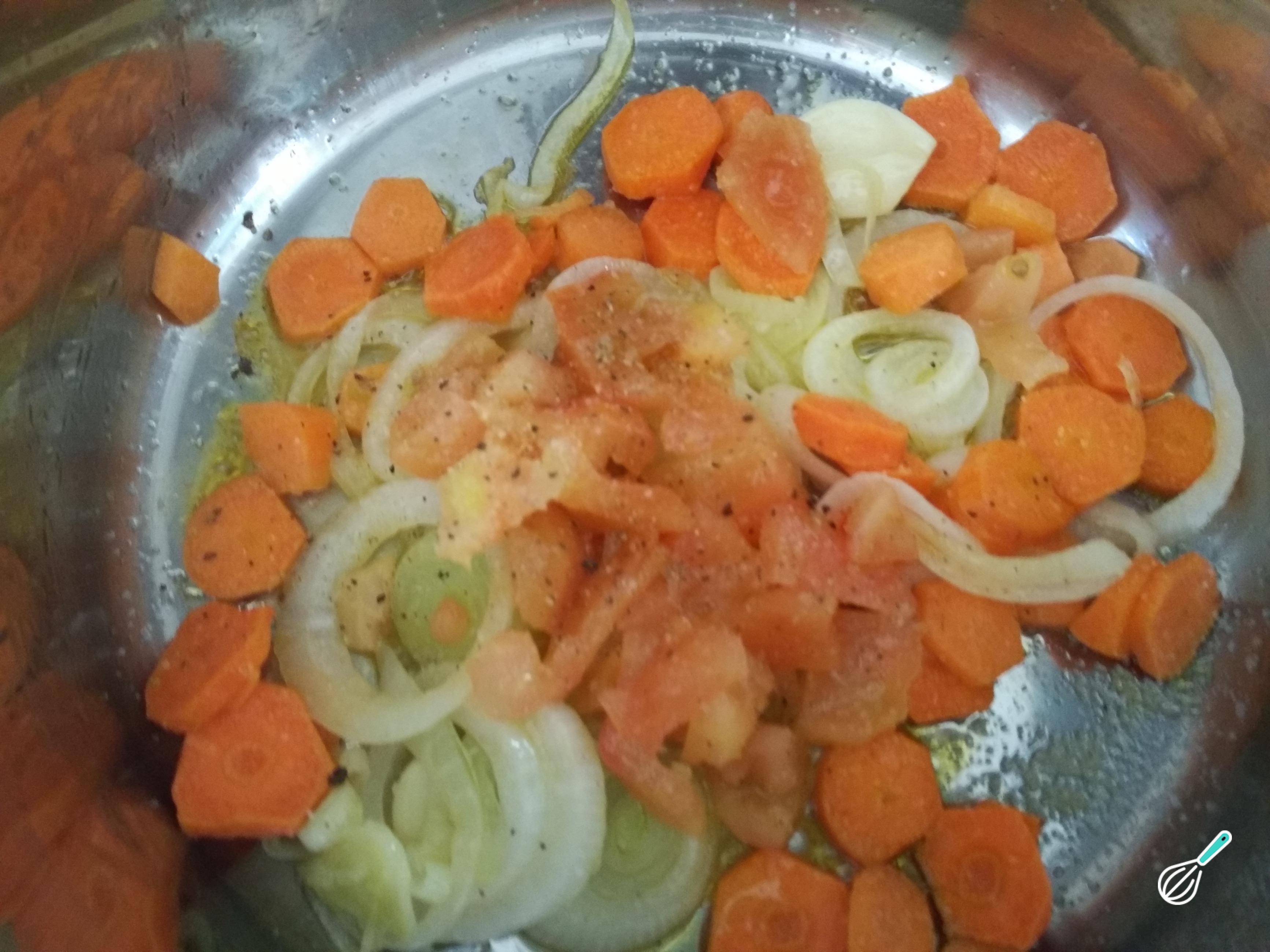Em seguida adicione os tomates picados sem as sementes, tempere com sal e pimenta e misture. Deixe cozinhar por mais 2 minutos no fogo médio, mexendo de vez em quando.