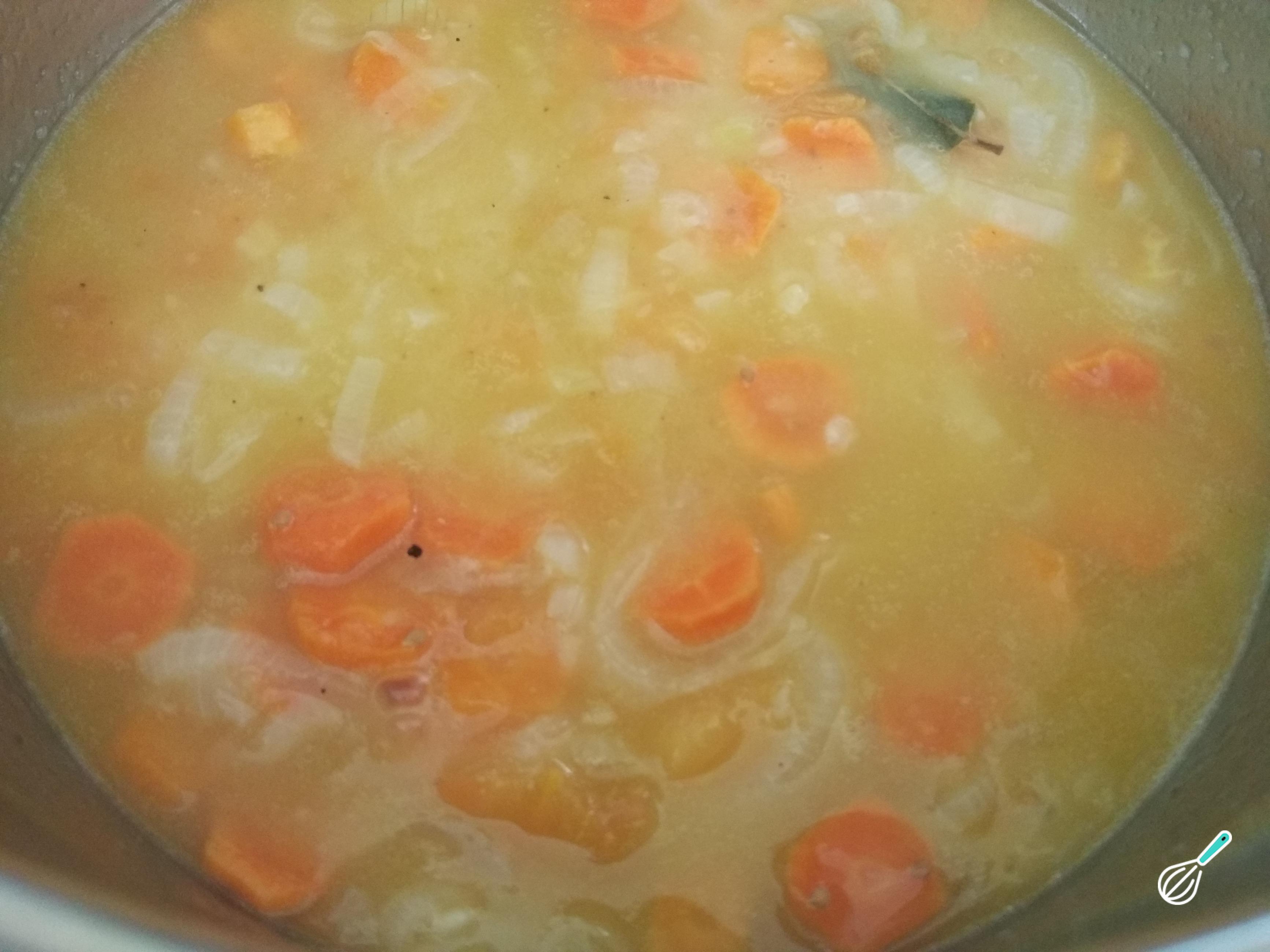 Adicione a água filtrada ou o caldo de peixe caseiro e também a folha de louro.