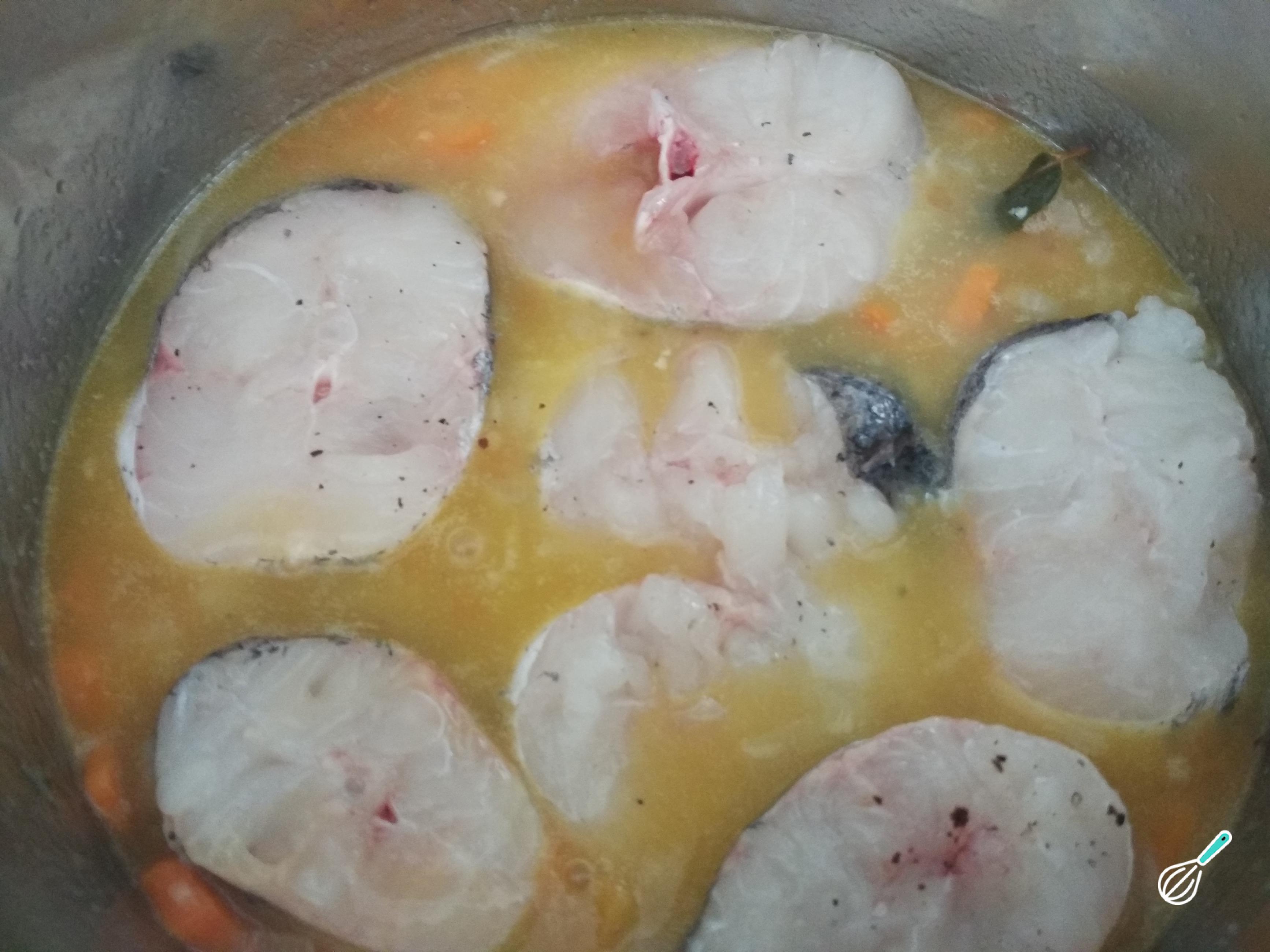 Adicione também as postas de merluza temperadas com sal e pimenta e deixe cozinhar por 5 a 10 minutos, com a panela destampada, virando as postas a meio do tempo para que cozinhem por igual de ambos os lados.