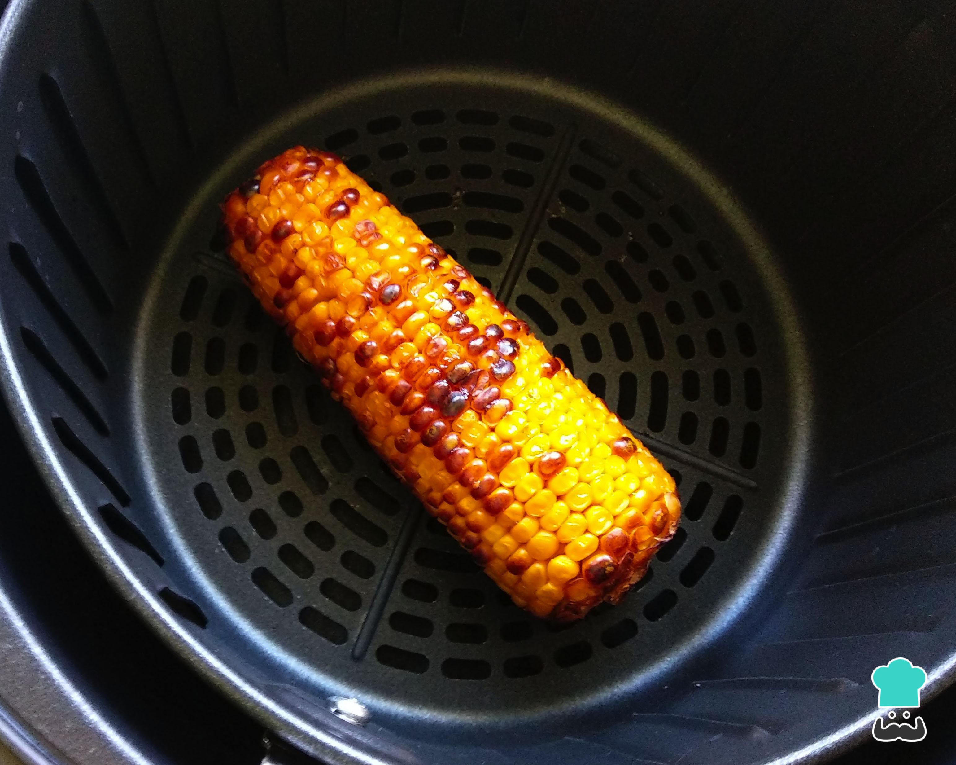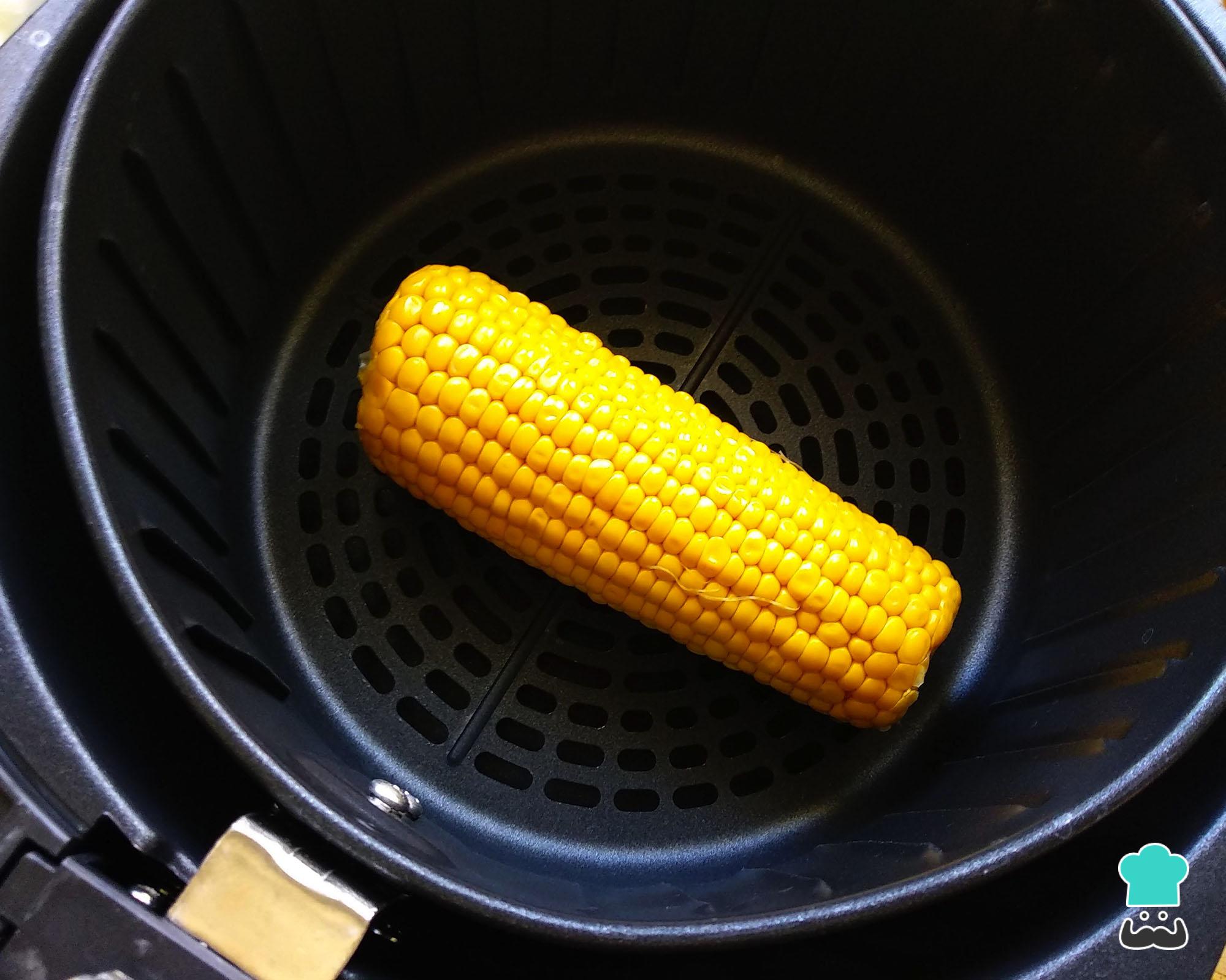 Limpe bem a espiga de milho retirando-lhe a palha e os fios. Lave, seque e coloque no cesto da AirFryer. Asse o milho nos 200ºC por 15 minutos.