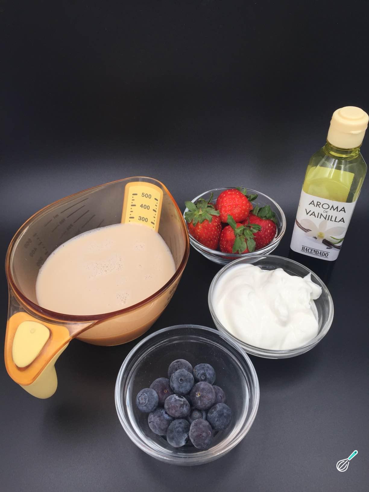 O primeiro passo para começar a fazer esta receita de milk shake de morango é separar todos os ingredientes.