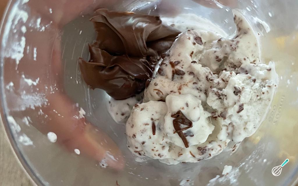 Num liquidificador ou processador, coloque as bolas de sorvete, o leite e as 4 colheres de sopa de Nutella e bata bem.